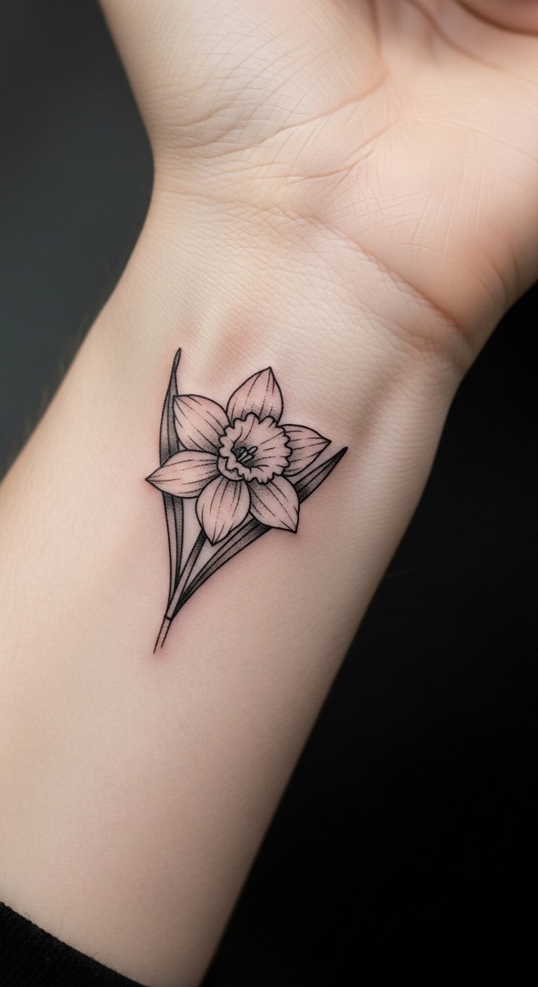 Wrist placement adds everyday subtlety to your tattoo. Trace a daffodil shape on your skin with washable ink as a test run. This spot keeps things low-key yet accessible. Opt for a small jonquil design for balance. Use household items like string to measure size at home. It saves on consultations by helping you decide fast. Pair it with simple lines for a clean look. You’ll find it practical for work or play.
