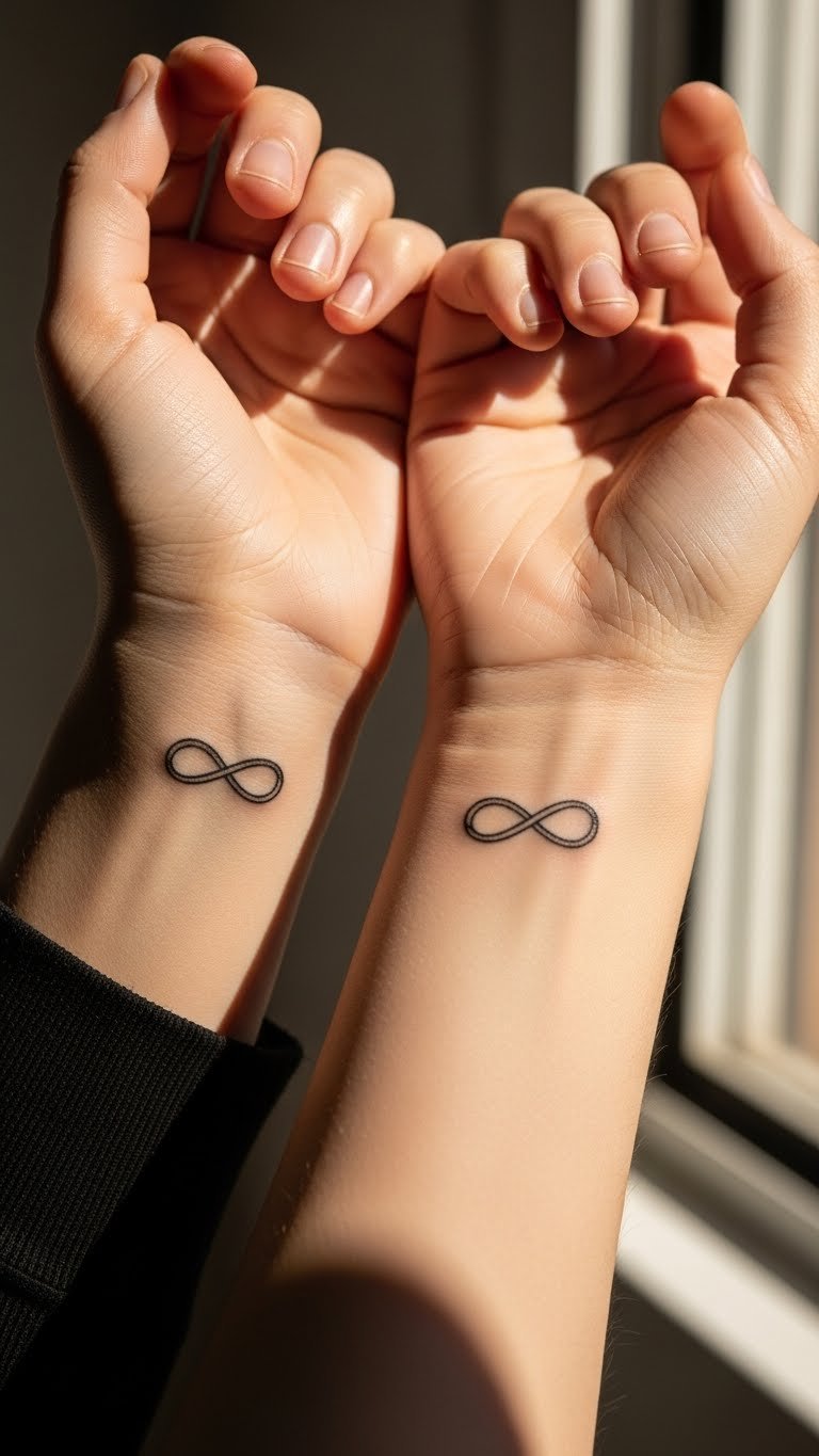 Think about infinity symbols if you want something timeless and straightforward. These tattoos use a basic loop design that says “forever” without extra fuss. Get one on your wrist for easy visibility. Start by sketching the symbol on paper to see how it looks—this DIY step helps avoid mistakes. Pick a local artist who offers deals under $100 for small pieces. Keep it budget-friendly by choosing black ink over colors. Short sessions mean less pain and cost. Pair it with your partner’s version for balance. Remember, placement matters; wrists heal fast and hide under sleeves when needed. Try drawing it with a henna pen first as a test run. This design works for couples and shows commitment in a low-key way. Go for thin lines to keep it elegant. You’ll love how it feels personal yet simple. Add a small twist, like a heart dot, for uniqueness without complexity. It’s all about that unbreakable link.