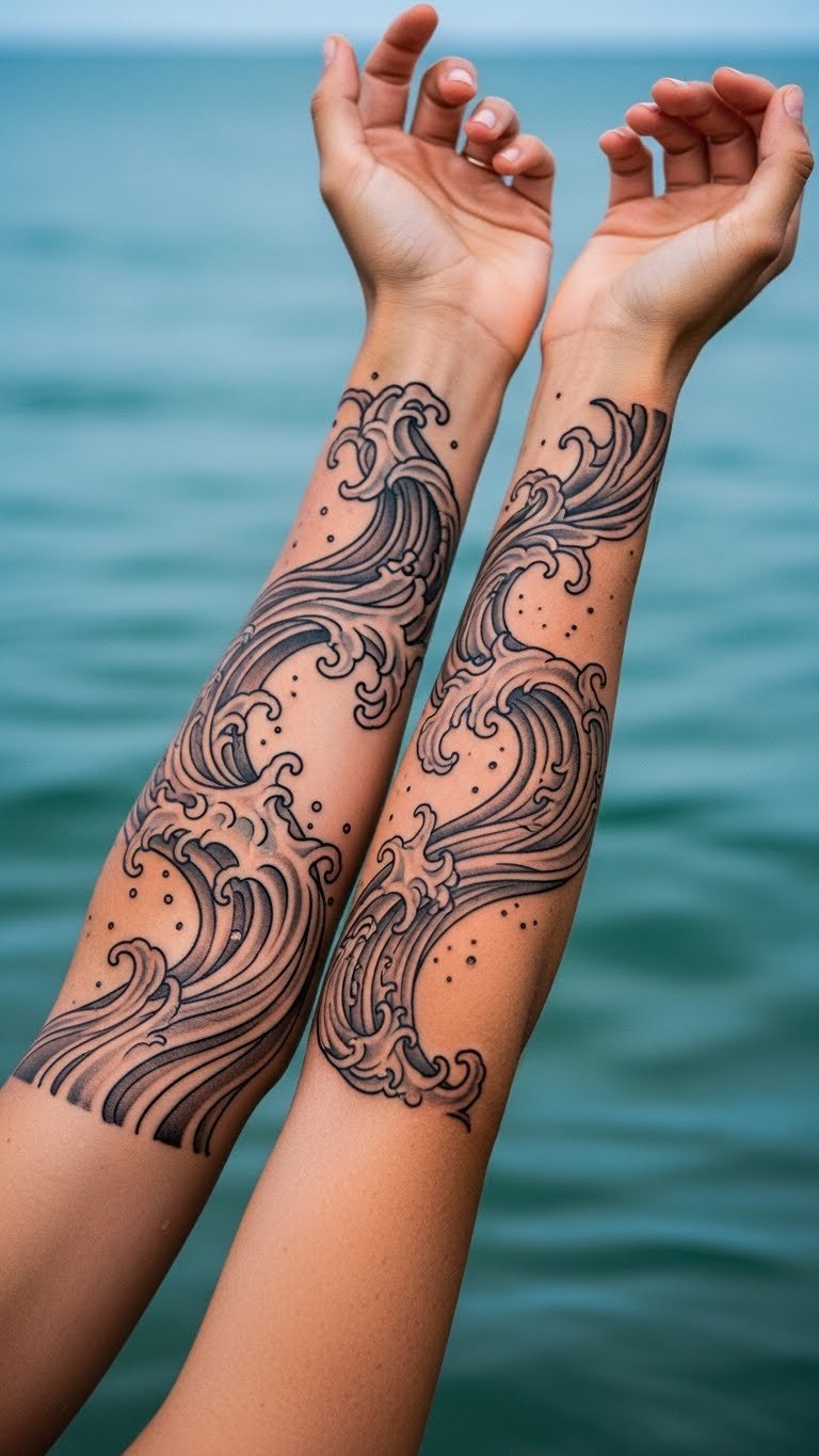 Wave patterns fit couples who love the ocean, mimicking the flow of water. Mirror the designs for harmony. Draw on beach sand first—this DIY fun ensures fit. Find coastal artists with seasonal discounts around $85. Choose monochrome for savings. Place on arms for wave-like motion. These tattoos withstand water and represent fluidity. Test with sea shells as stencils. Add a fish for personalization. Great for water enthusiasts, it captures essence. Opt for curves over fills. You’ll feel the vibe daily. Share ideas during walks to save time. It’s a fluid expression.
