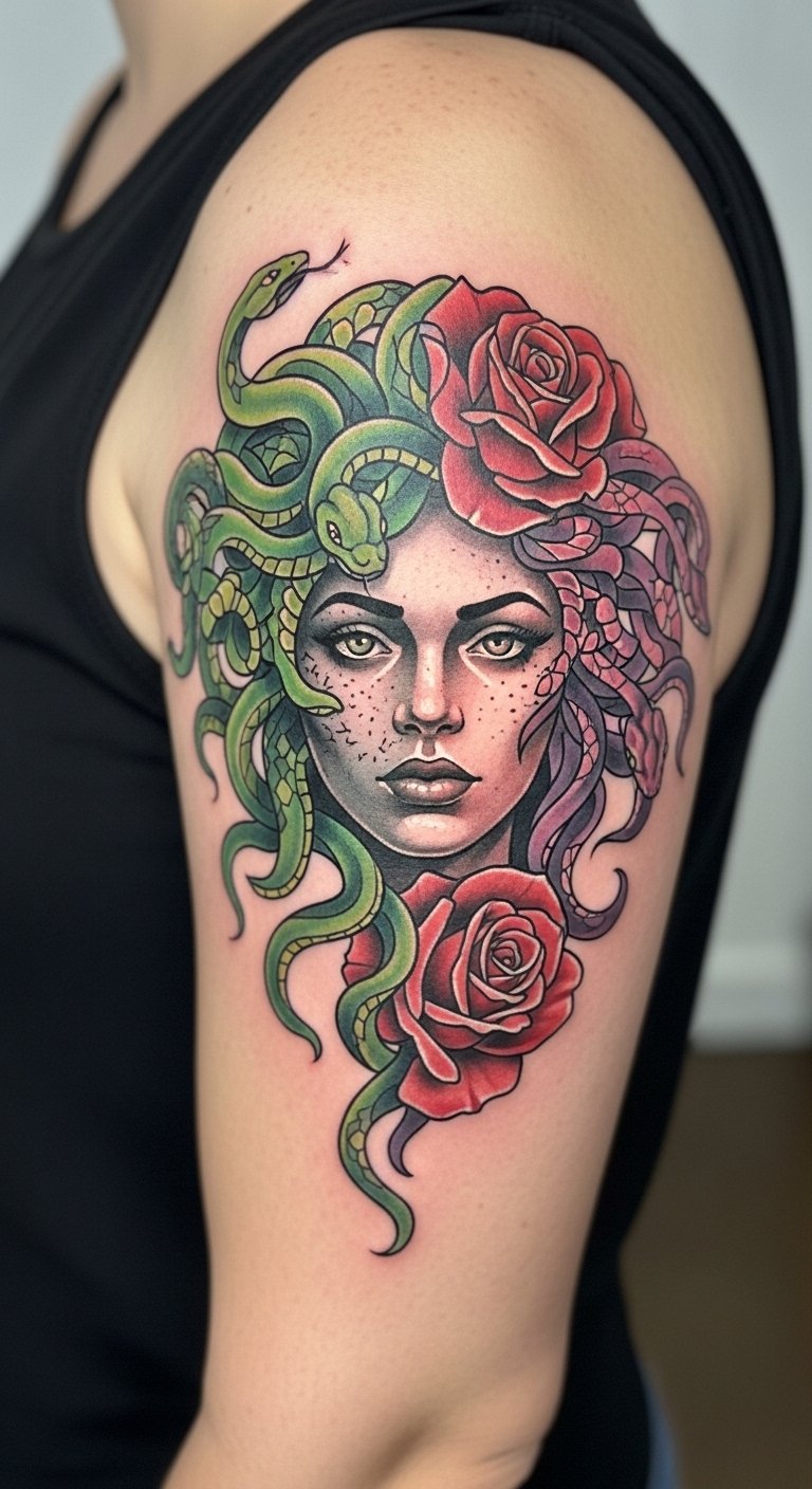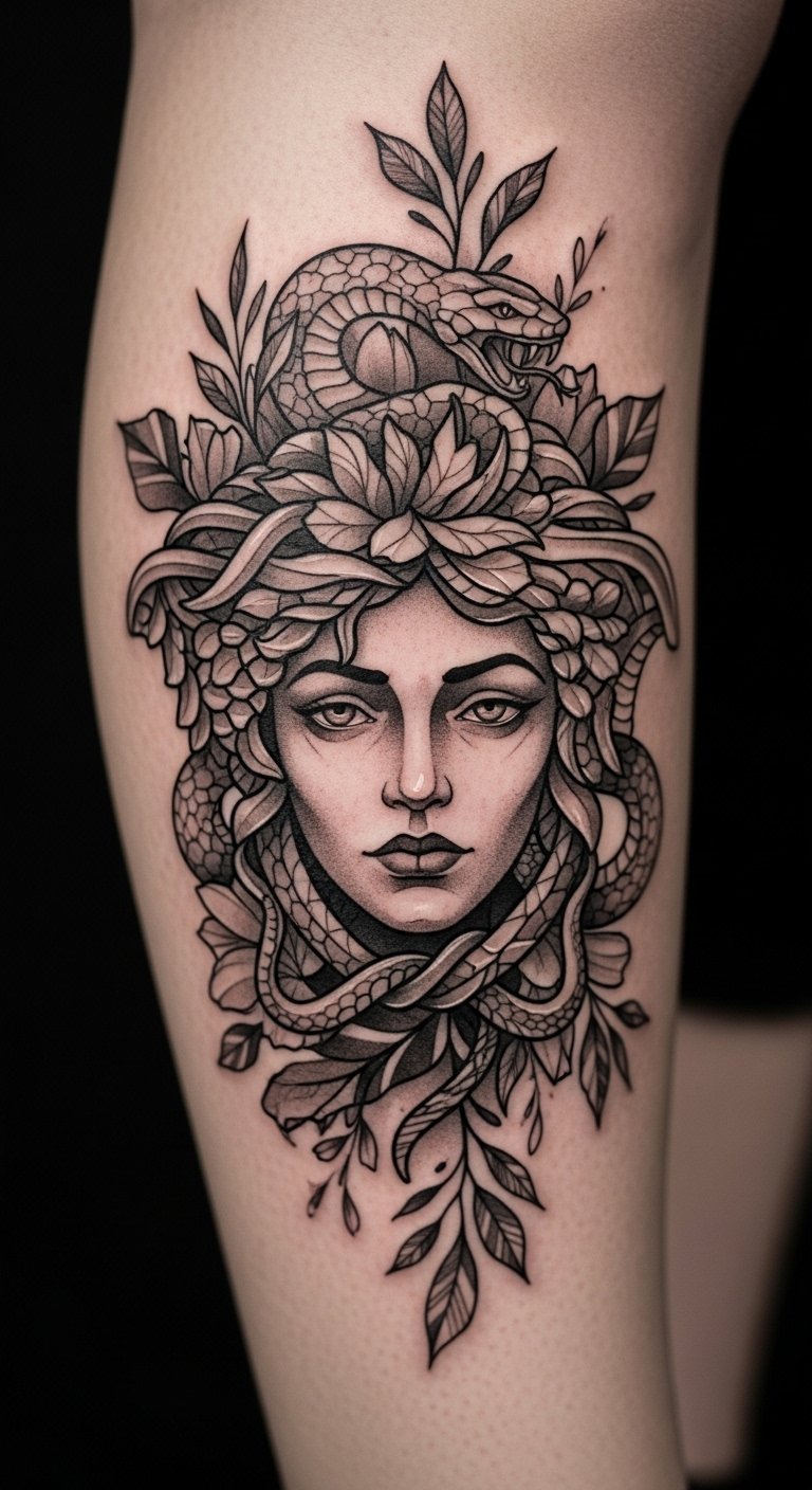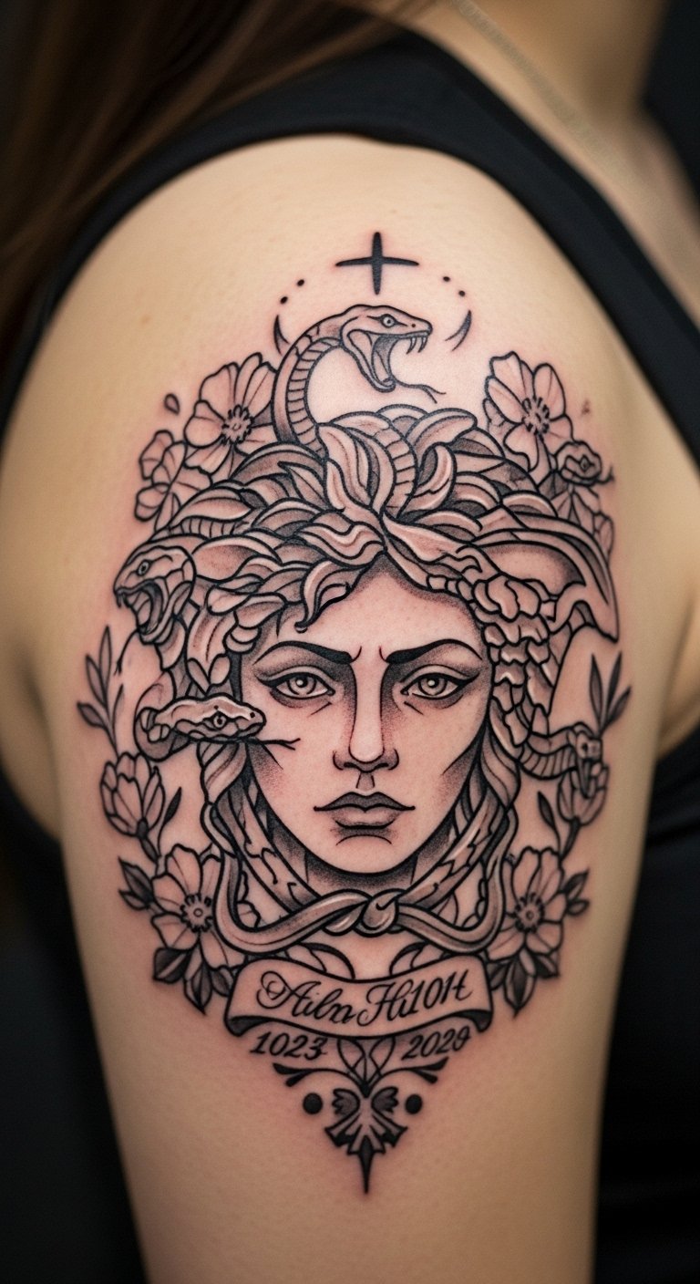Mix Medusa with flowers like roses for a soft touch. This combo adds blooms around her snakes. It blends beauty with inner fire. Practice drawing petals next to her face on paper. Find free templates online to mix and match. Buy cheap markers for mock-ups. Transformation feels fresh this way. Opt for local flowers in your design to keep it personal. Use DIY kits for temporary tattoos under $5. Place it on visible spots for daily reminders.