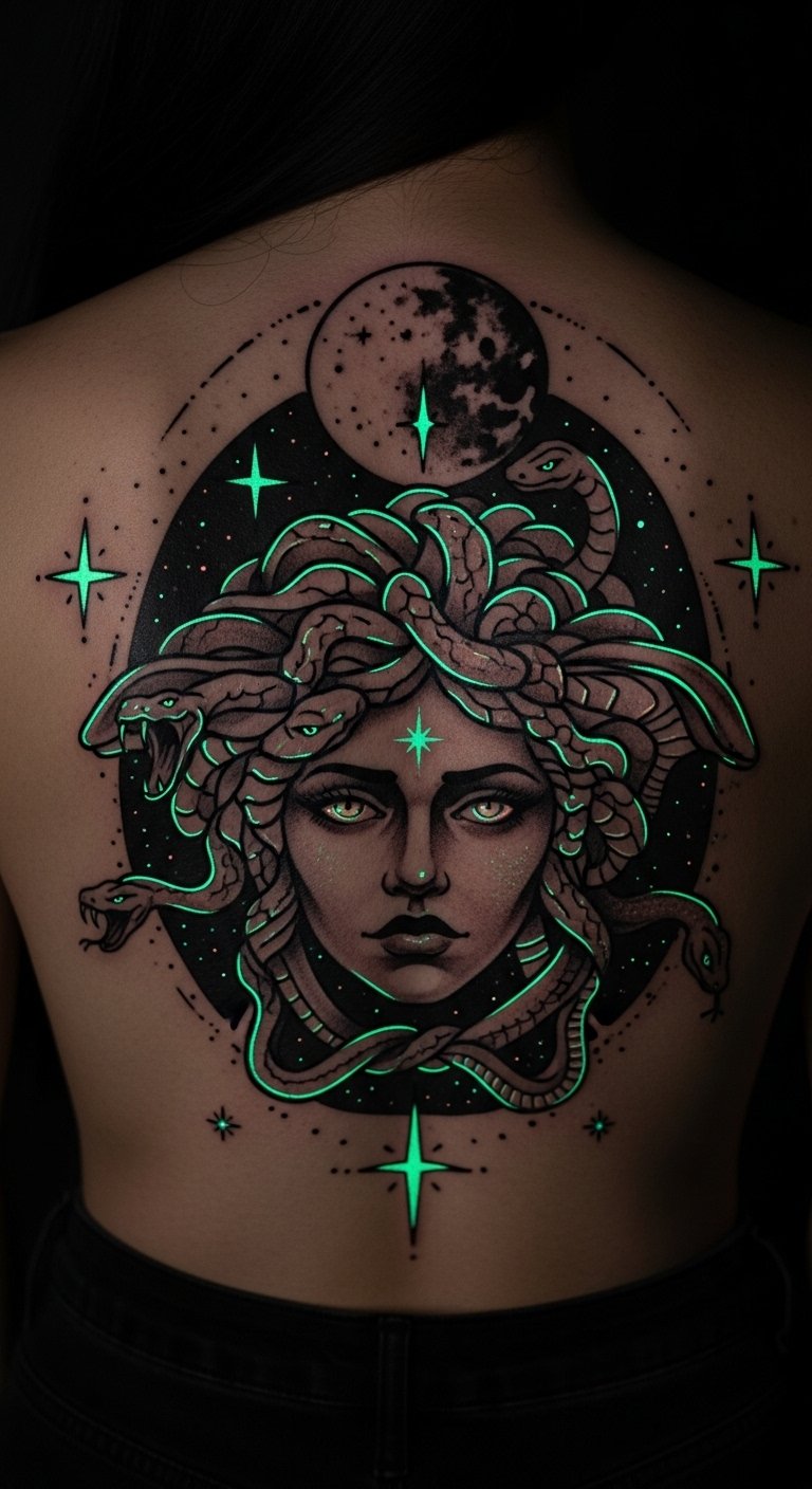 Add stars and moons to Medusa for a cosmic vibe. This design places her among night sky motifs. It represents guidance through tough times. Sketch stars around her outline at your desk. Download free celestial patterns to combine. Use glow-in-the-dark pens for fun tests. Protection grows from these additions. Look for sales on art supplies to save. Try a star-themed temporary tattoo first. Position it on the upper back for a grand feel.