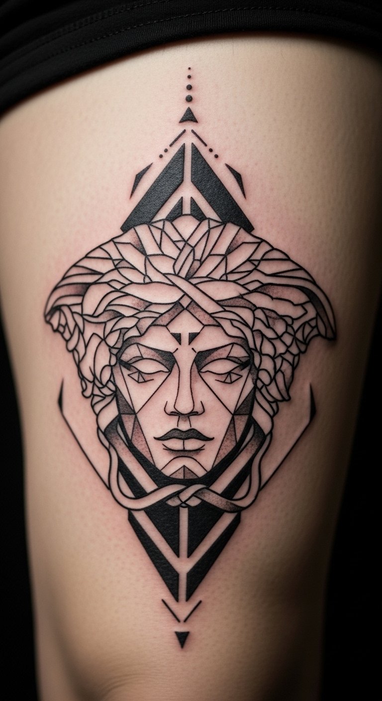 Layer Medusa with geometric shapes like triangles. This modern twist makes her look structured and bold. It turns myth into abstract art. Draw simple shapes around her form on paper. Grab free geometric stencils from online sources. Experiment with string art for ideas. Strength emerges in the symmetry. Keep costs down with household items for sketches. Apply a peel-off version to see it live. Choose spots like the calf for easy viewing.