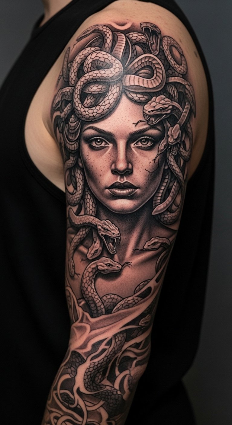 Go big with a half-sleeve Medusa that covers the arm. This large design packs in details for a full story. It shows commitment to personal growth. Plan it out with sketches on large paper. Use phone apps to preview on your skin. Share costs by booking group sessions. Healing starts with thoughtful placement. Opt for affordable artists in your area. Test with arm bands made from fabric. Focus on areas that tell your tale.