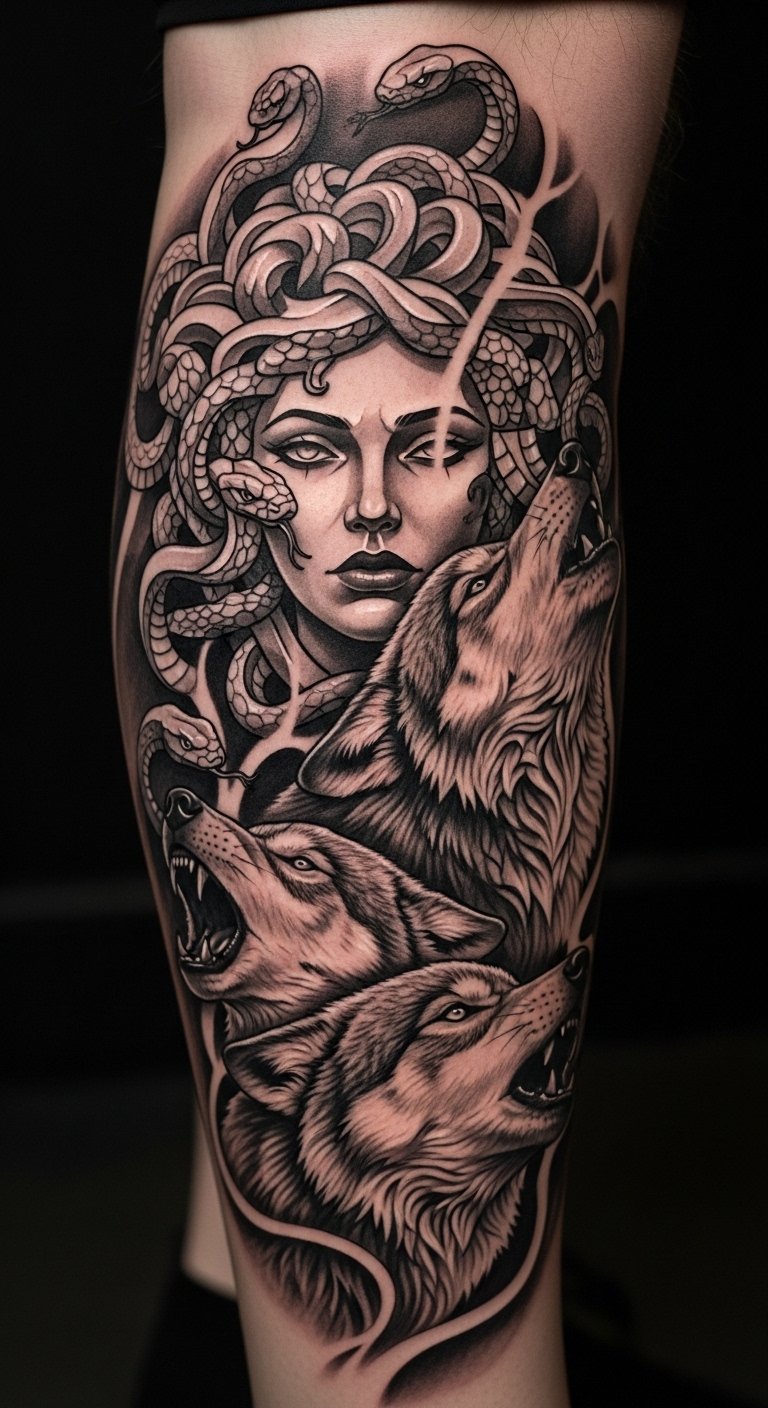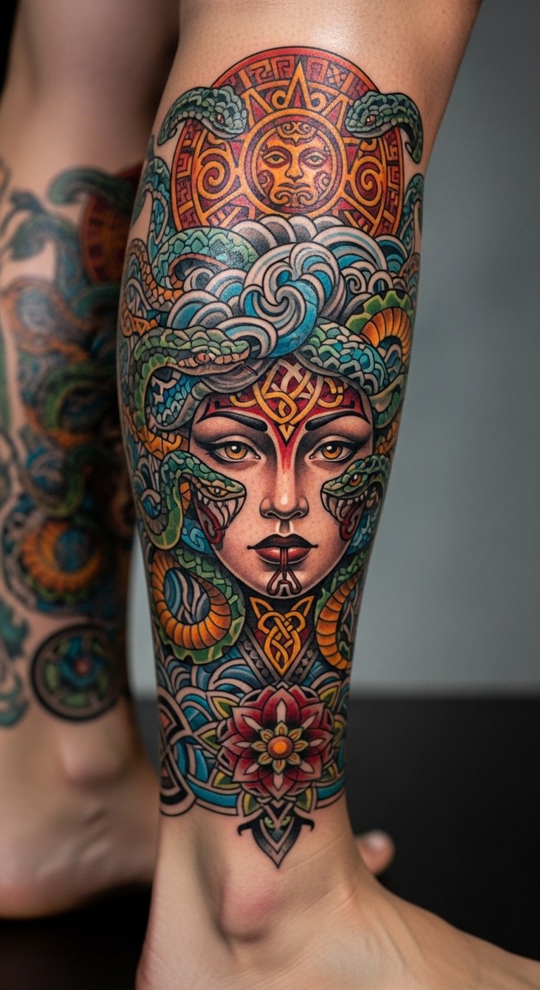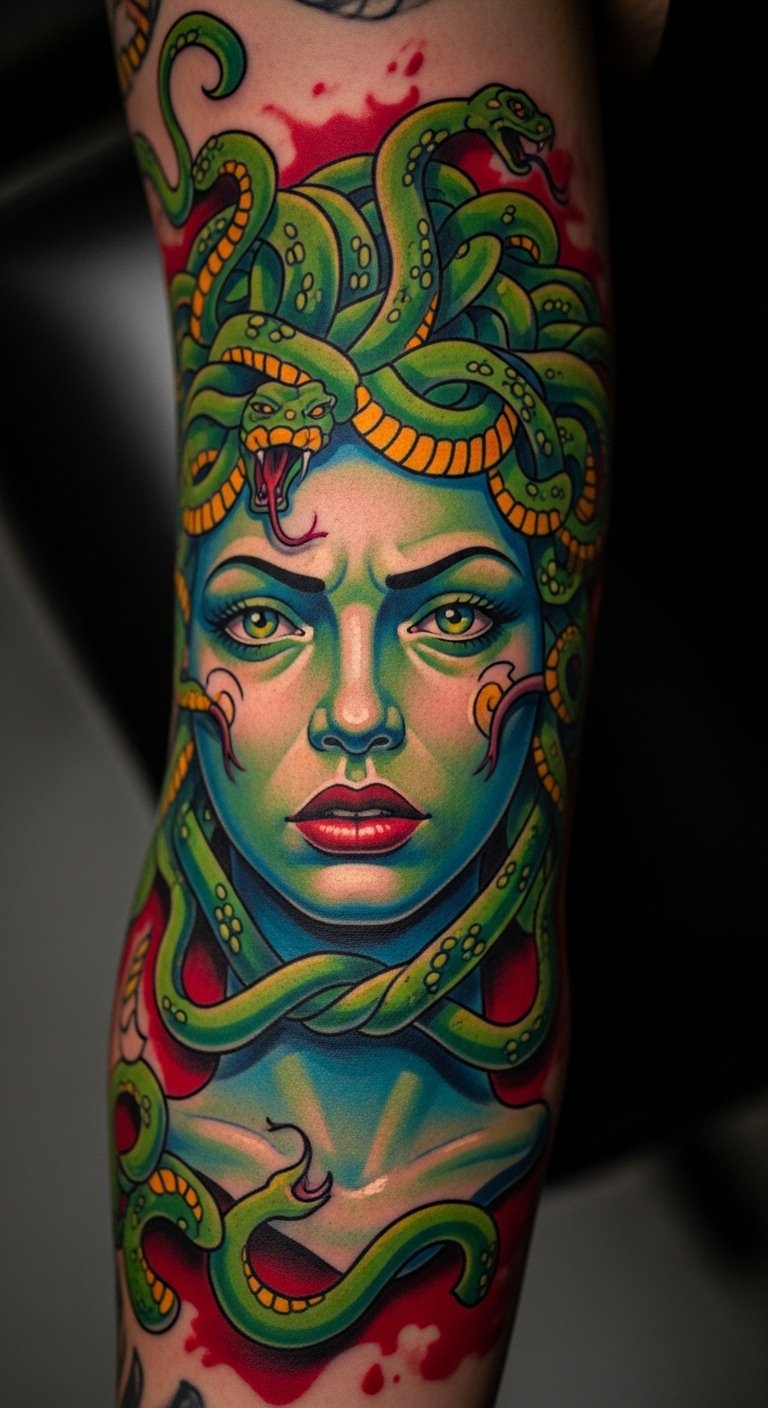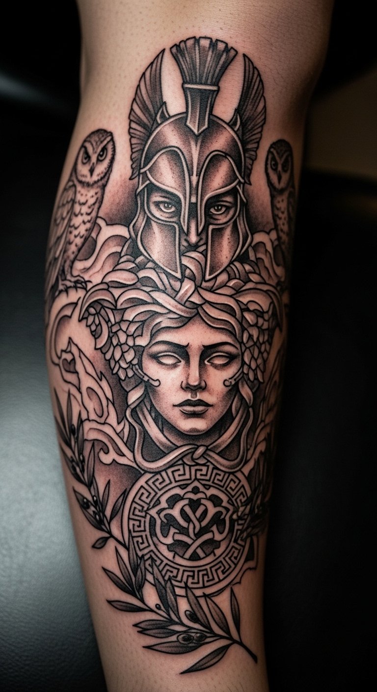 Pair Medusa with Athena for a mythological mash-up. This design adds shields or owls to her form. It explores deeper stories of conflict and wisdom. Draw both figures side by side simply. Search for free myth-inspired templates. Use colored pencils for quick ideas. Resilience builds from these connections. Keep it budget-friendly with shared design sessions. Test with stickers on your skin. Put it on the leg for a narrative flow.