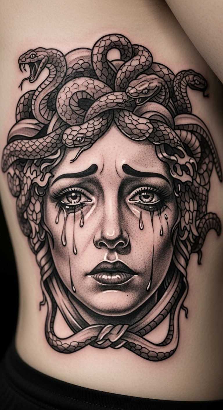 Go abstract with swirling shapes for Medusa. This style bends the myth into art. It invites your own spin. Doodle abstract forms at home. Find free abstract guides online. Mix with paints you have. Transformation sparks imagination. Opt for affordable practice sessions. Use body paint for trials. Place on ribs for a hidden gem.