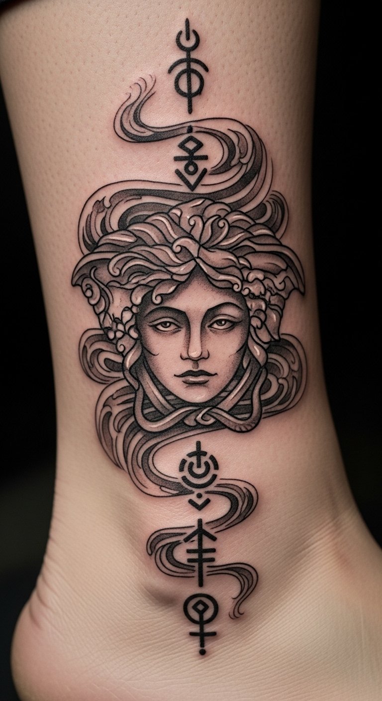 Incorporate healing motifs like waves with Medusa. This design marks recovery paths clearly. It helps process experiences visually. Map your journey on paper first. Use free symbol generators online. Add elements with everyday pens. Healing feels tangible this way. Opt for low-cost temporary options. Test on the ankle for mobility. Keep designs simple to afford.