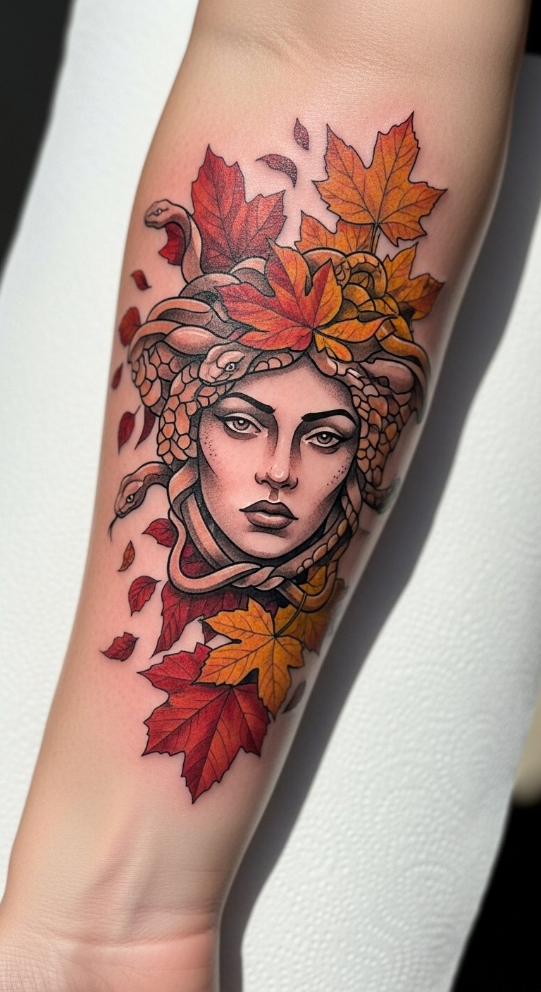 Add leaves or blooms for a seasonal Medusa vibe. This version changes with the year for freshness. It connects to nature’s cycles. Collect real leaves to trace. Find free seasonal templates. Sketch with colored items at home. Strength renews with these additions. Buy budget art kits for tests. Use washable tattoos for seasons. Place on forearms for visibility.