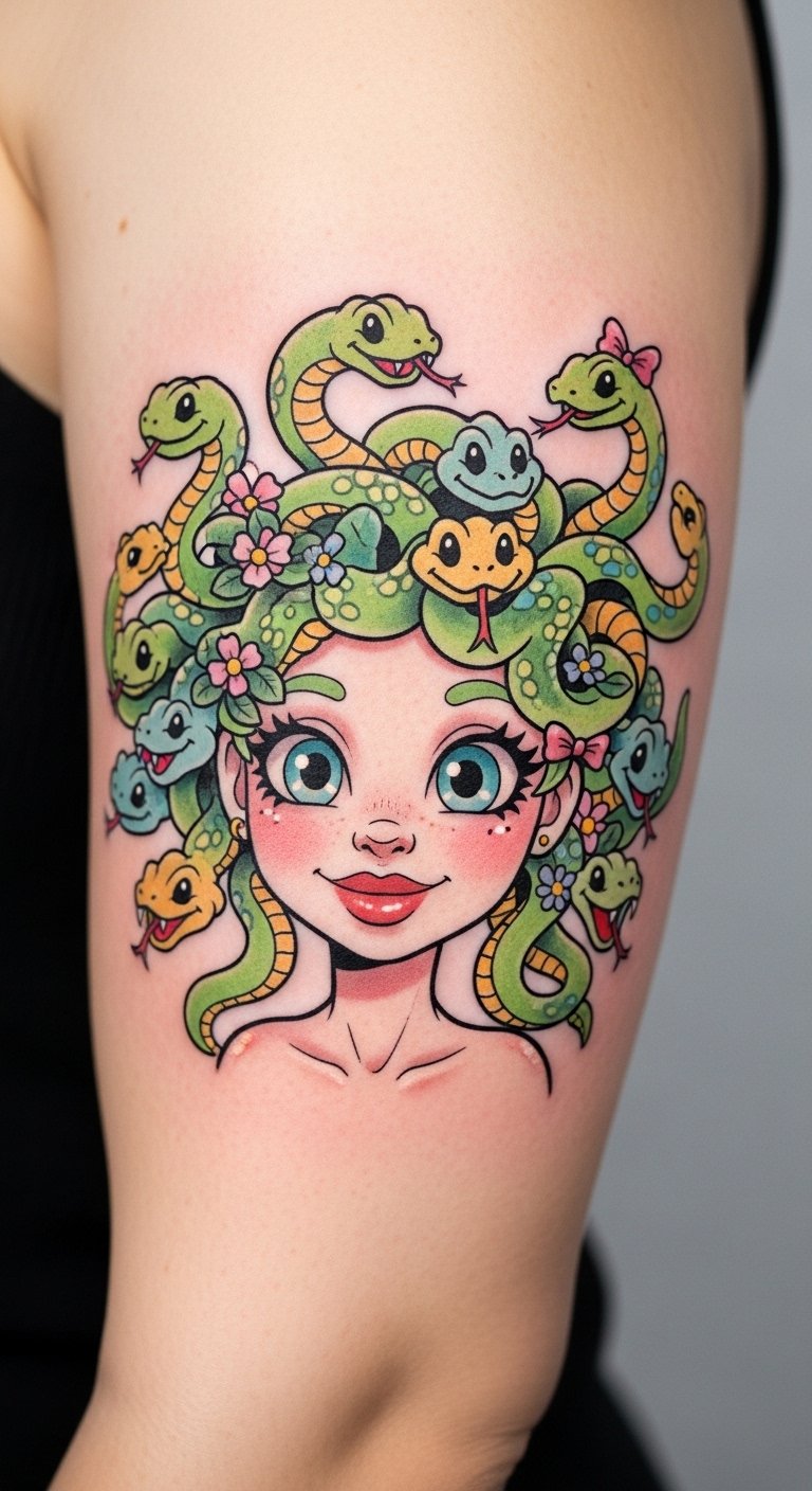 Add fun twists to Medusa for a playful feel. This design includes smiles or extras. It lightens the mood. Doodle playful elements at home. Find free fun patterns. Use colorful markers. Resilience with a smile. Save by keeping it light. Test with fun temporaries. Put on arms for cheer.