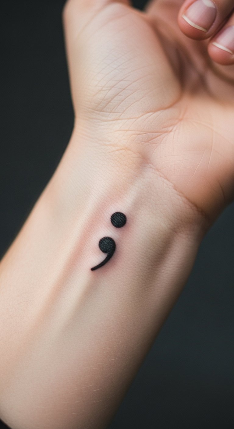 A semicolon tattoo means your story goes on. It’s a popular choice for those facing tough times. This design reminds you of hope every day.