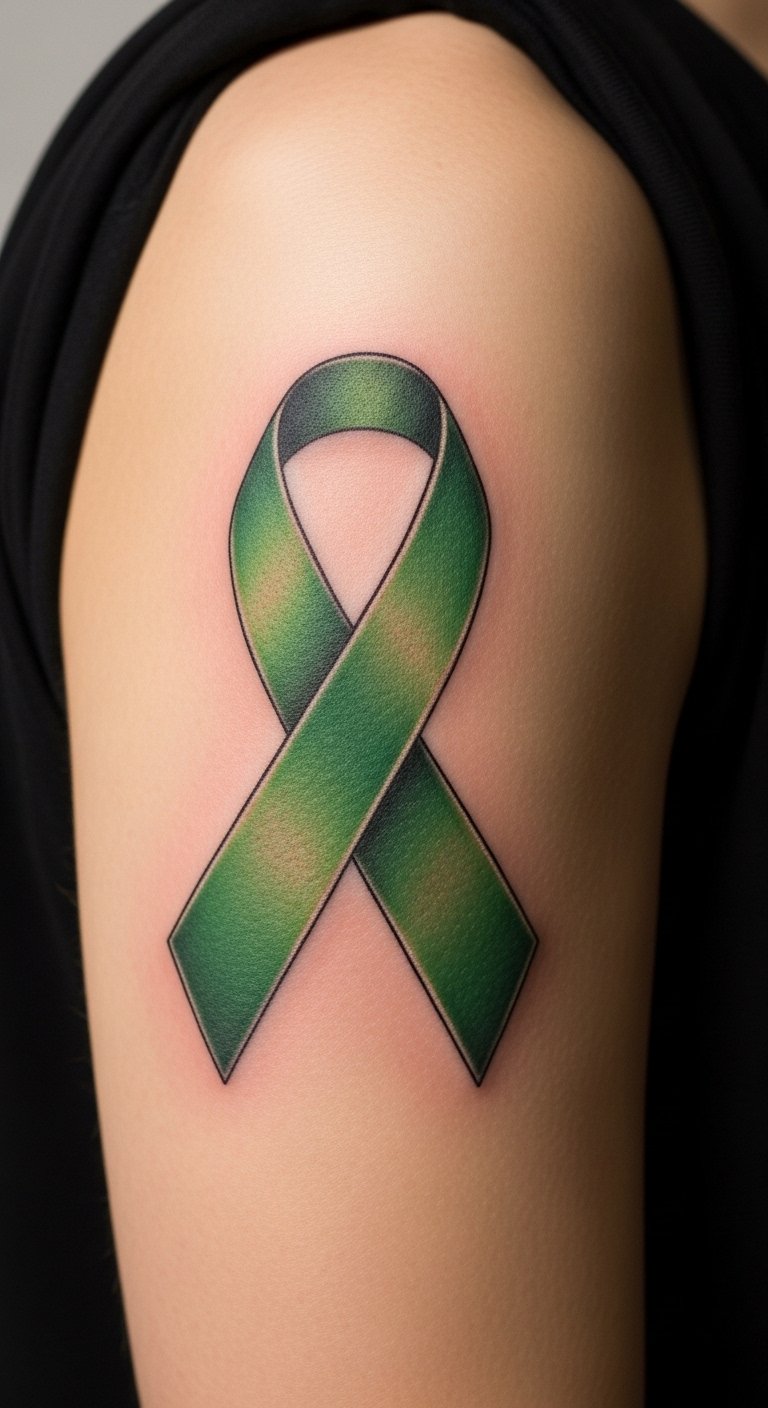 A green ribbon tattoo promotes mental health awareness. It connects you to a larger community. This ink spreads a message.
