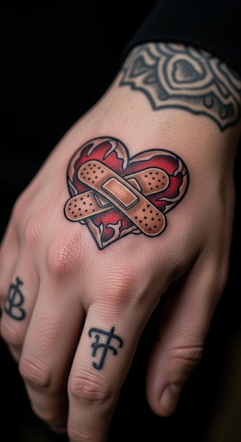 A heart with bandages tattoo shows emotional healing. It covers scars and represents care. This ink aids recovery.