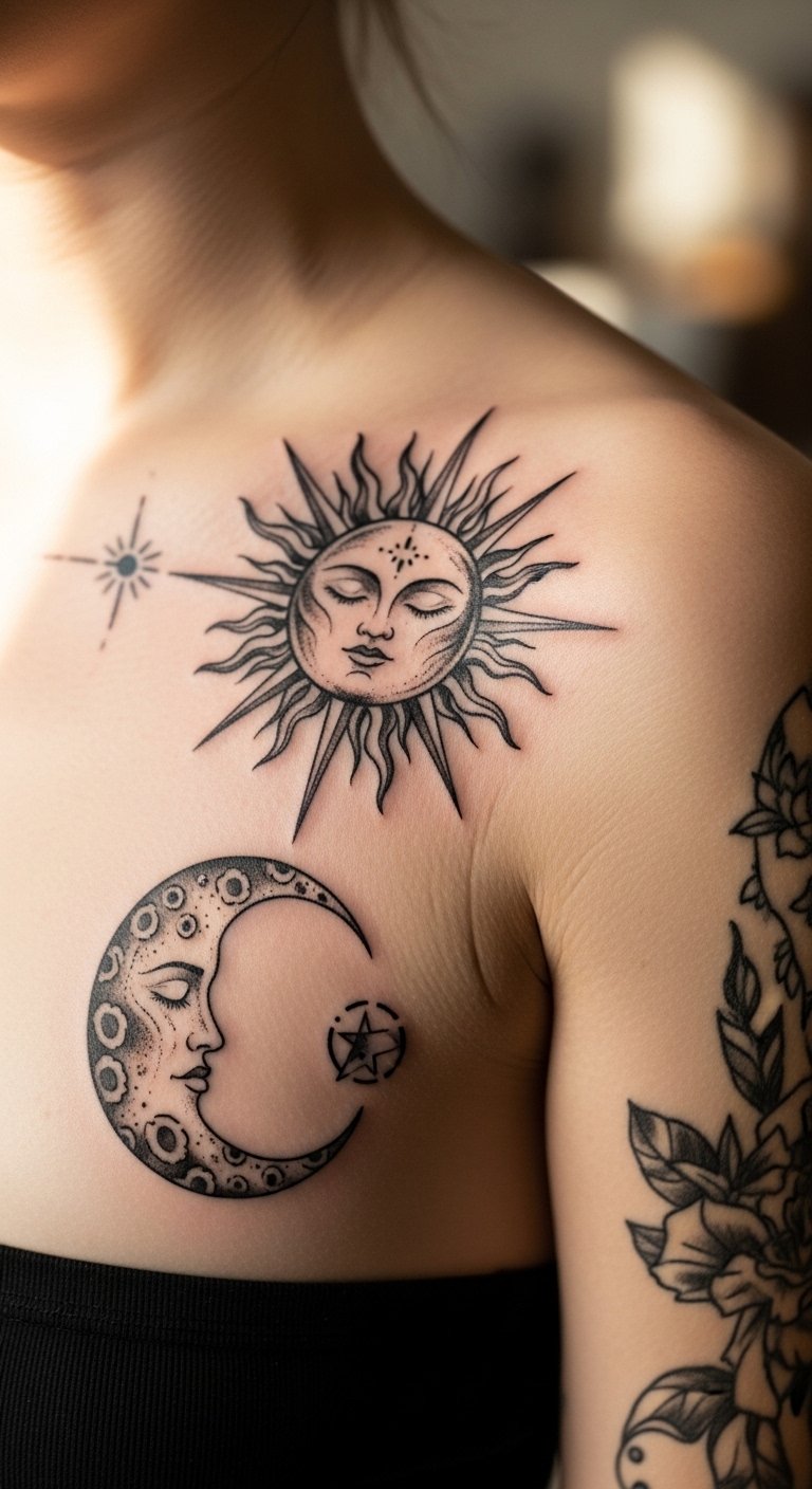 Sun and moon tattoos represent day and night balance. They show life’s dualities. This design fosters peace.