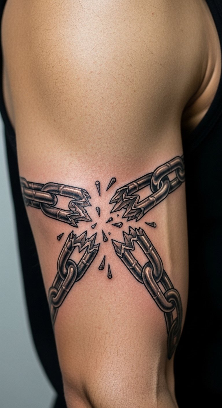 A broken chain tattoo means breaking free from chains. It symbolizes release from struggles. This design empowers change.