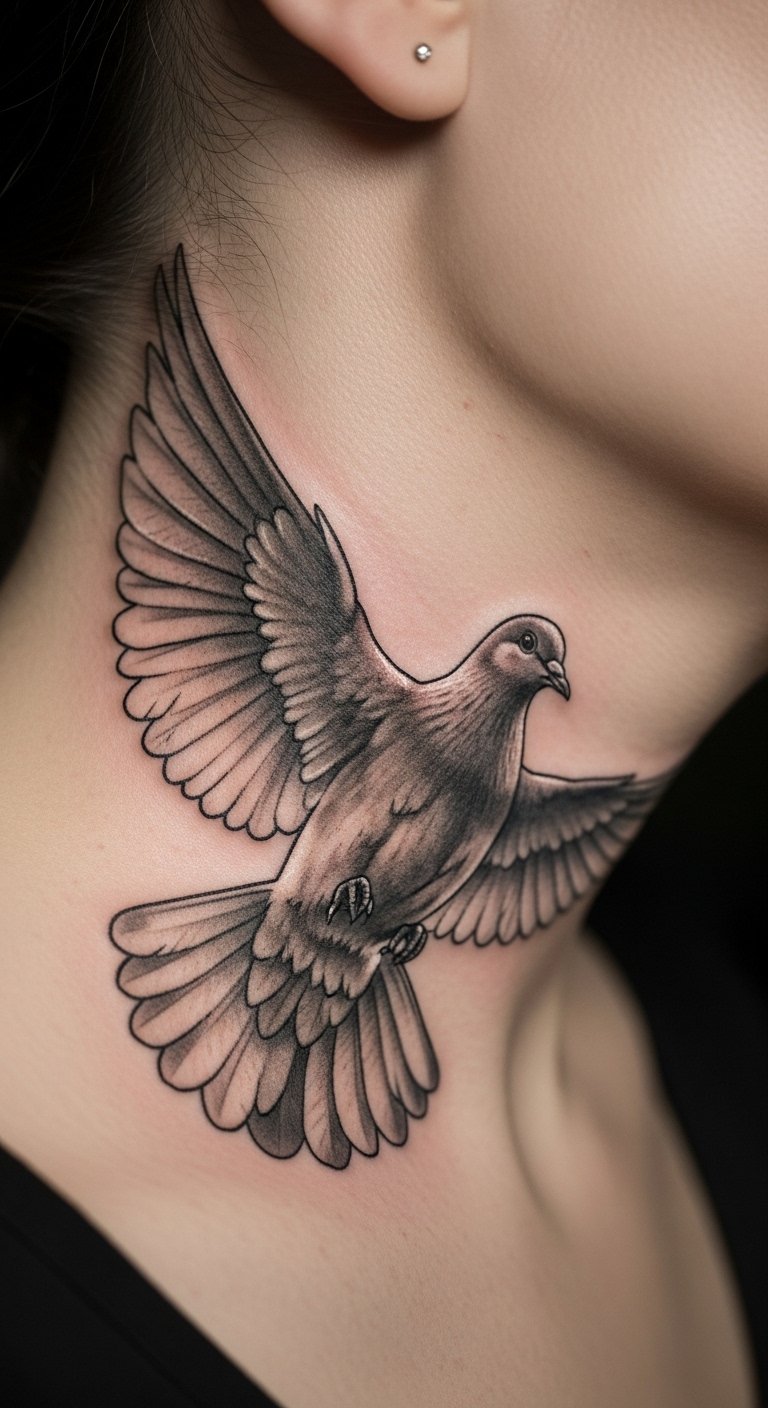 A dove tattoo stands for peace and serenity. It flies above worries. This design brings quiet.