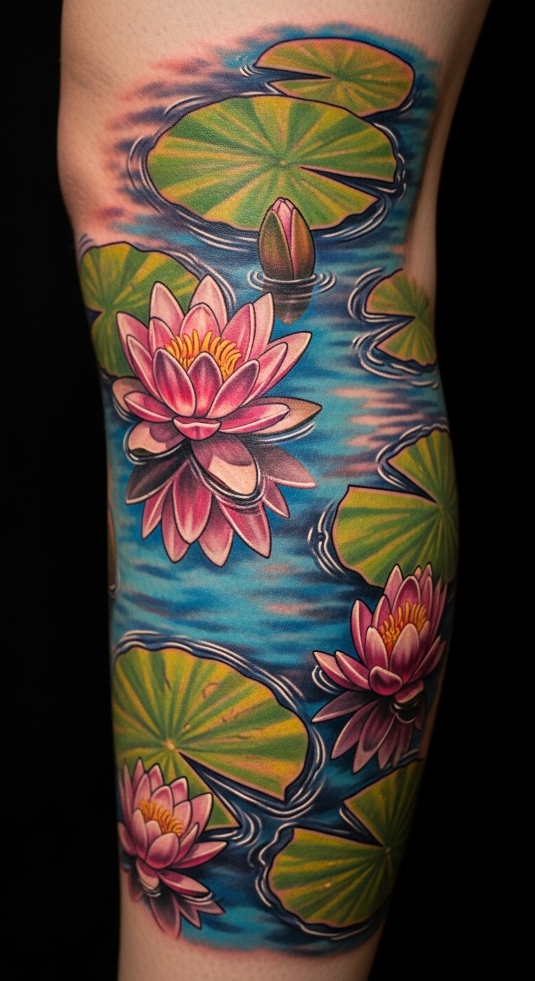 A water lily tattoo means serenity in depths. It grows in murky waters. This ink fosters peace.