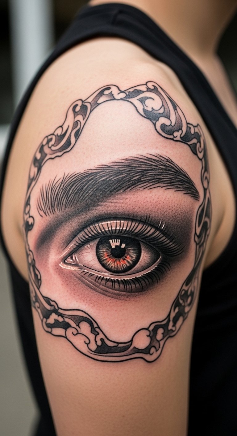 Eyes that mesmerize. This tattoo highlights his gaze. Choose your upper arm. Sketch eyes from photos. Use apps for quick edits. Stick to black for budget. Include a tear for depth. This design draws attention. Select an artist with eye work. Runs $70. See his soul in it.