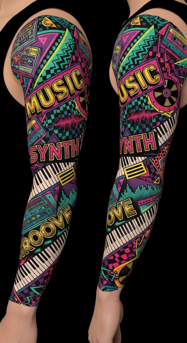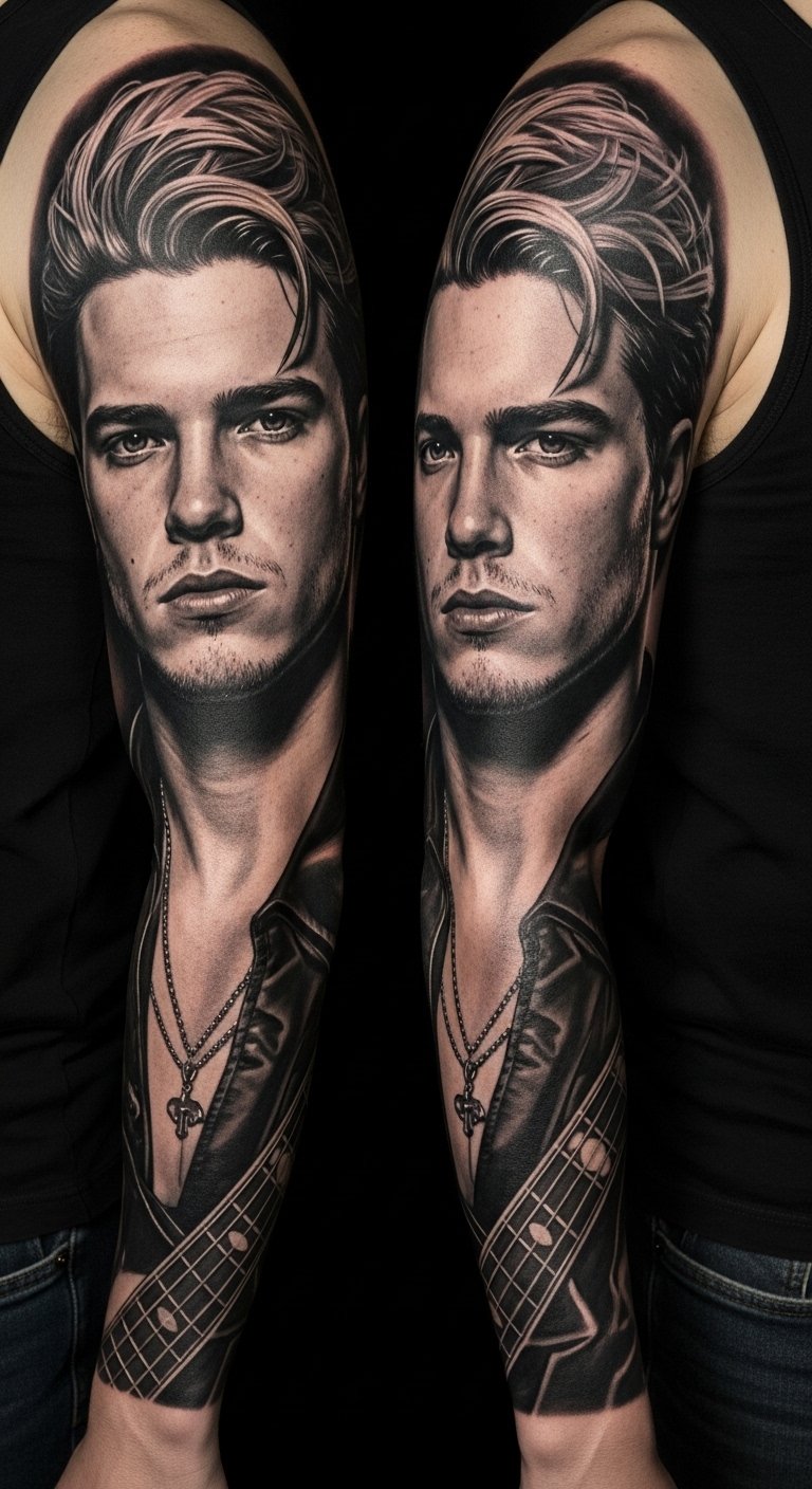 Sleeve for full tribute. This arm flows with icons. Start small and build. Draw sections first. Find free layouts. Layer over time. Include favorites. This builds gradually. Choose phased artists. Starts at $200. Wear your passion.