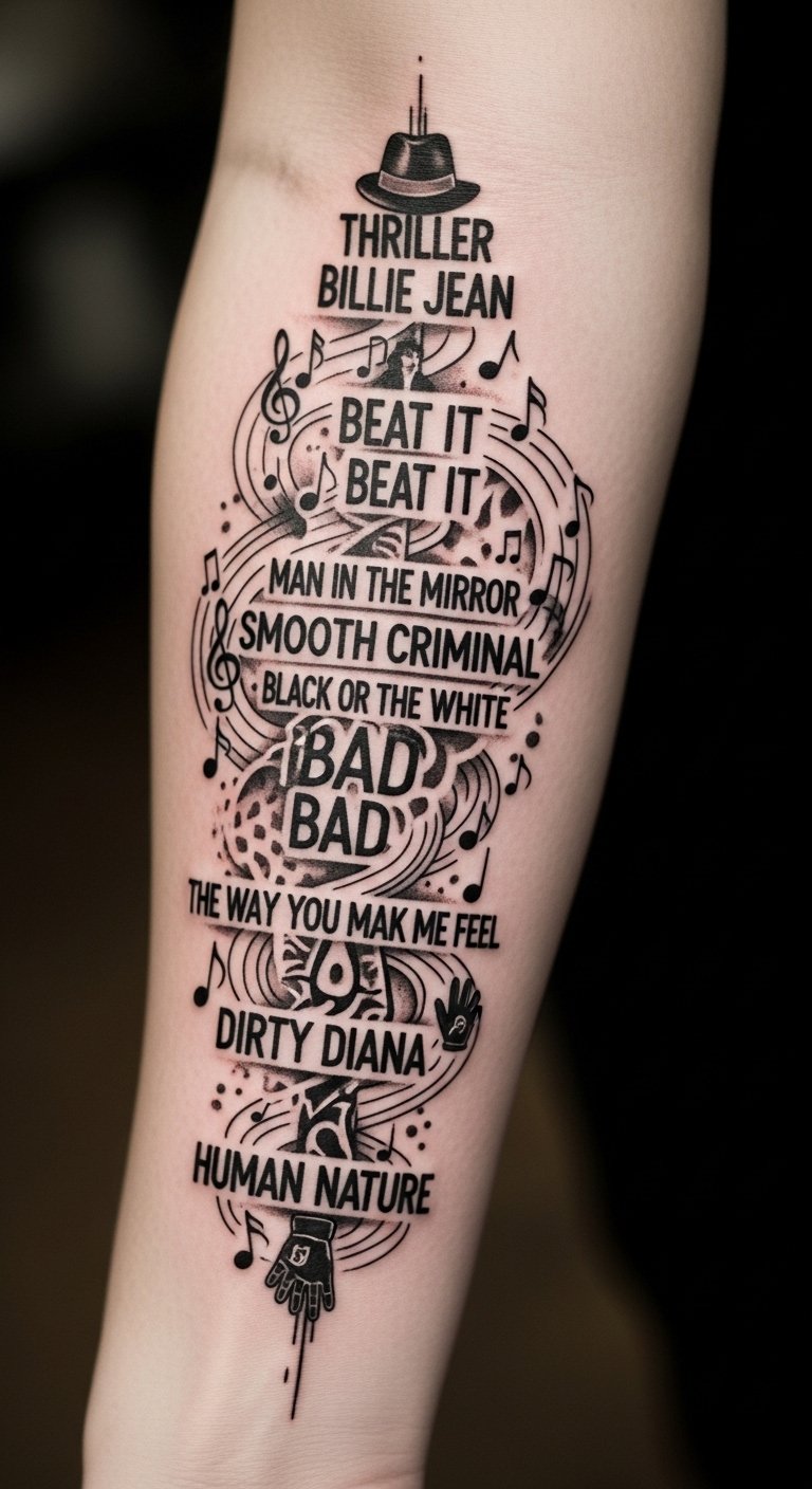 His autograph says it all. This script captures MJ’s famous signature with flowing letters. Put it on your arm for a personal touch. Practice drawing it from online images. Use a phone app to mirror your ideas. Go for black and white to save money. Add a date of your favorite concert for something unique. This design fits under clothing if you want privacy. Find an affordable artist through social reviews. Expect to spend around $50 to $80. It’s a quick way to show your fandom.