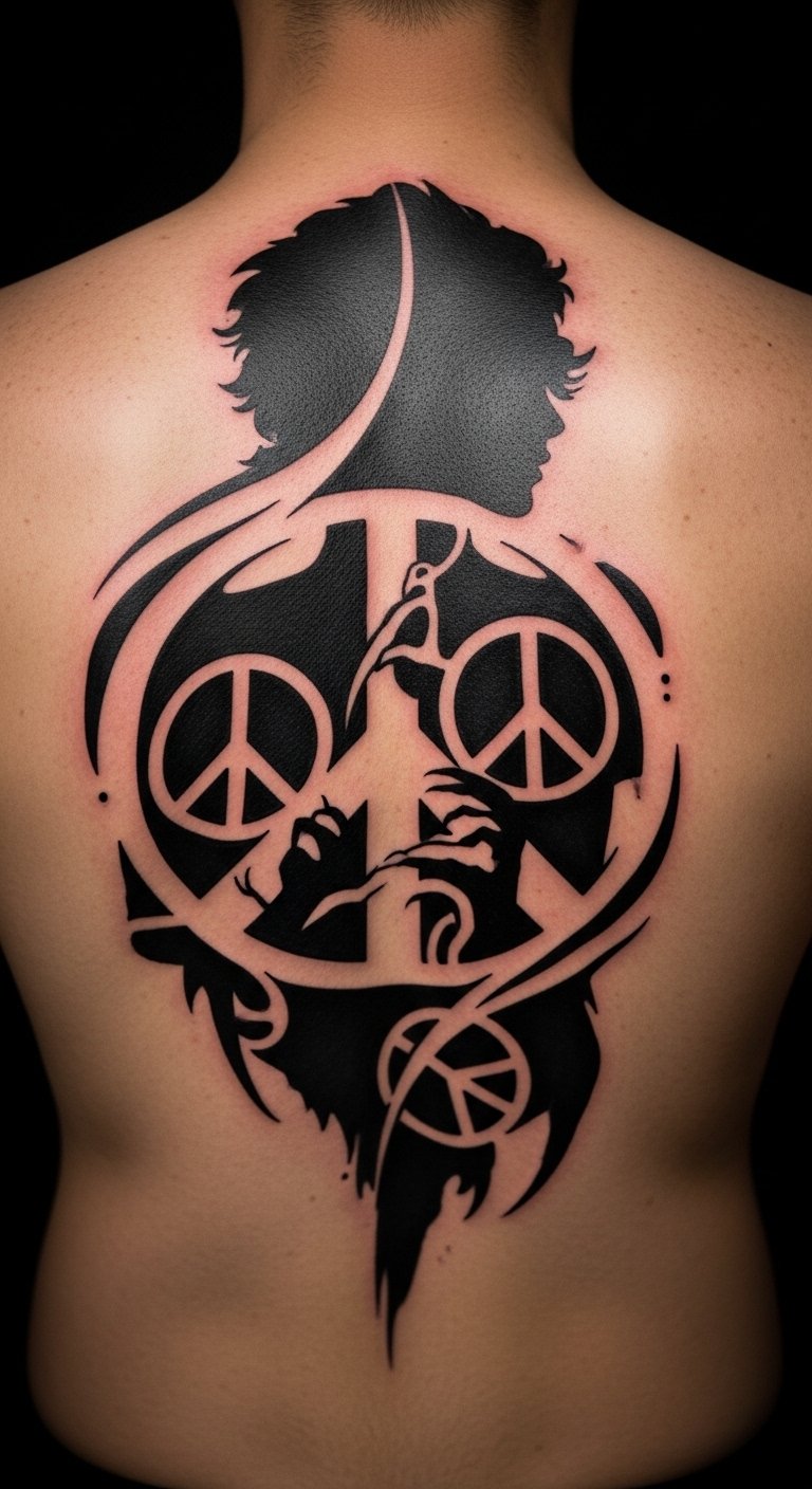 Peace blended in. This mixes icons. Put on your arm. Draw peace signs. Combine elements. Keep balanced. Add global touches. This unites fans. Look for mix pros. $80 total. Share the message.