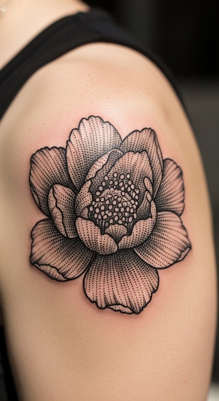 7. Charming Dotwork Flower on Shoulder