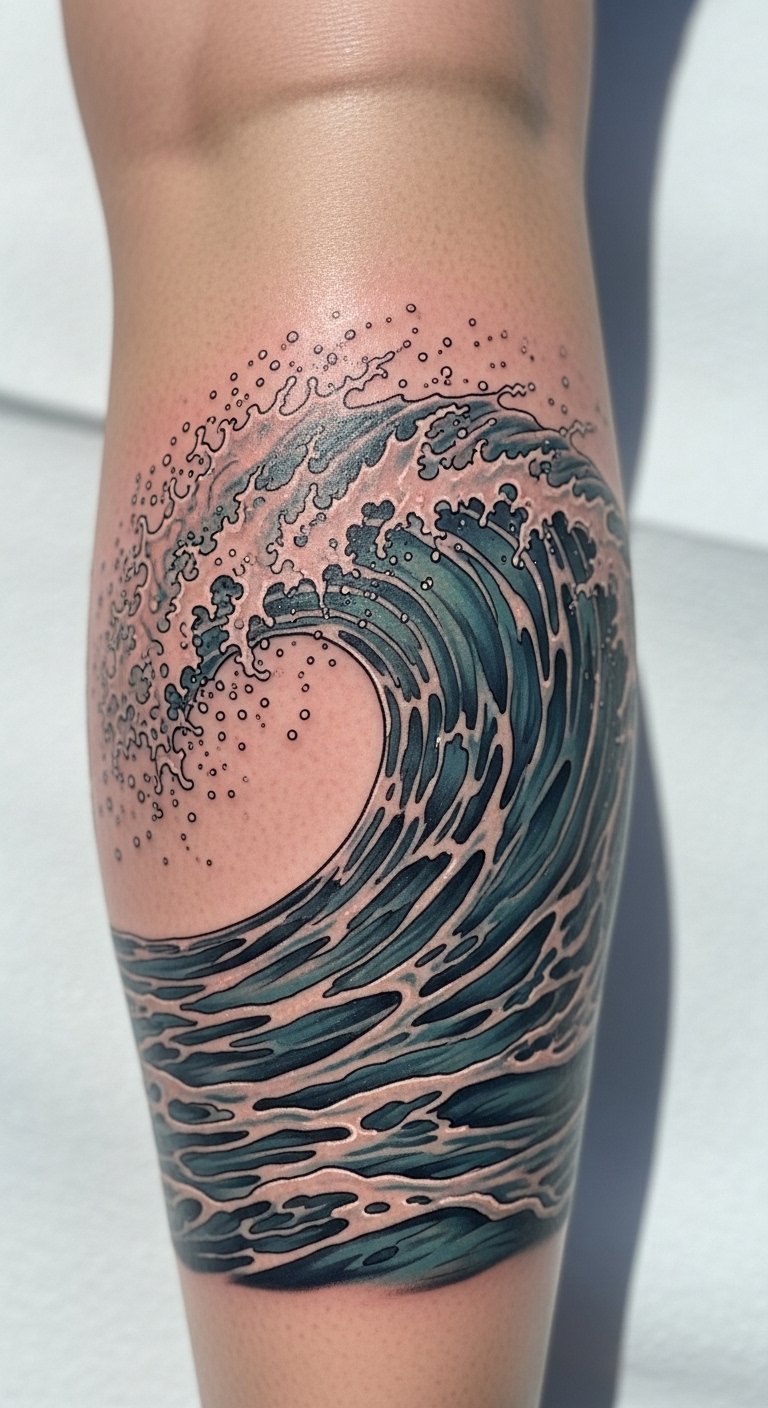 Evoke the ocean with waves on your calf. It feels like a beach escape. Outline waves on your leg with chalk. Find nearby artists offering specials. Put it on less active areas. Practice with sea shell drawings. Stick to waves for easy vibes. Bold the key: nearby artists. Go for quick appointments. Make it a breeze to start.