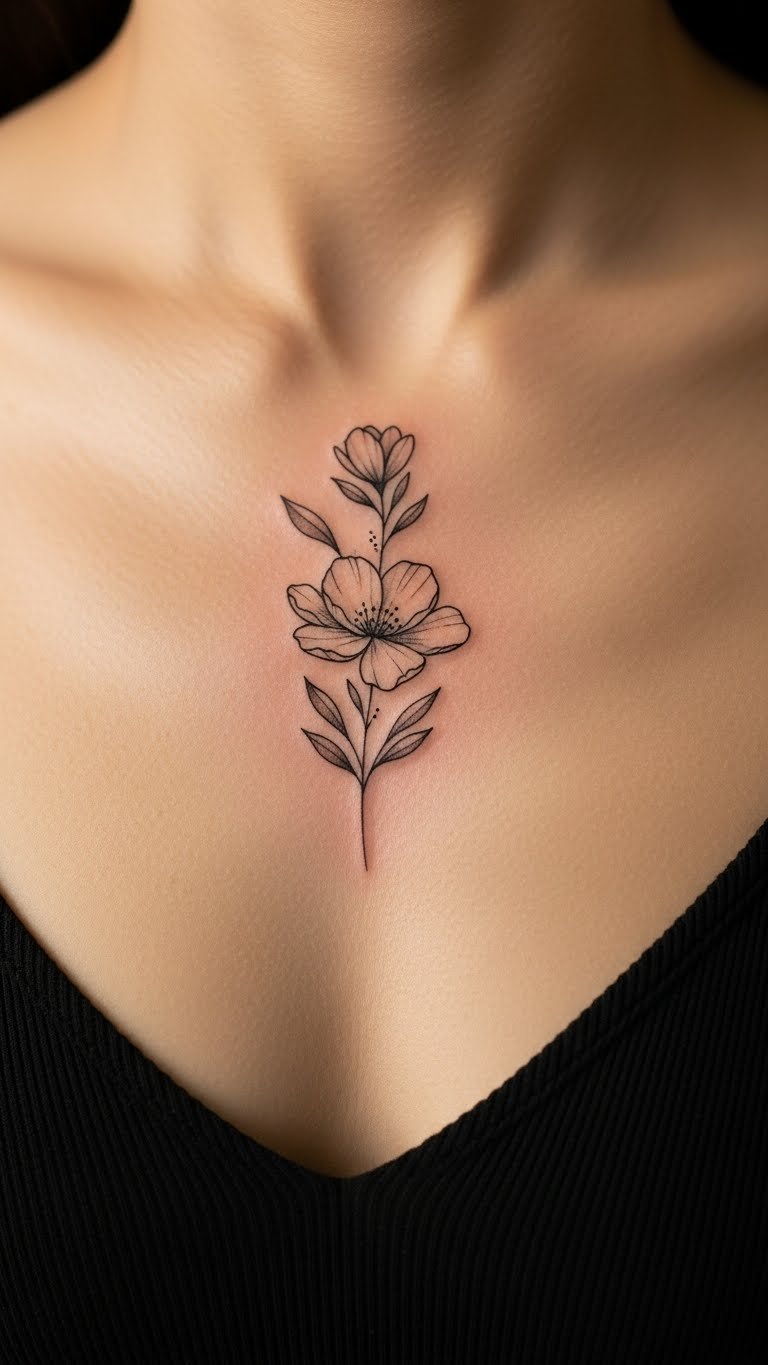 Think about a small floral design right in the middle of your chest. It adds a touch of nature to your skin. Start with a sketch on paper. Use a pen to draw tiny flowers. This helps you visualize the look. Pick a budget-friendly artist from local shops. They often charge less for simple work. Go for black ink to keep costs down. It lasts longer and suits all skin tones. Try a DIY practice session with henna. Draw a fake tattoo at home. This lets you test the spot without commitment. Focus on symmetry for a balanced feel. Place it over the sternum for a centered effect. You’ll love how it feels personal and elegant. Choose designs with meaning, like a rose for growth. Keep it small for easy hiding under clothes. This way, you control when to show it off.