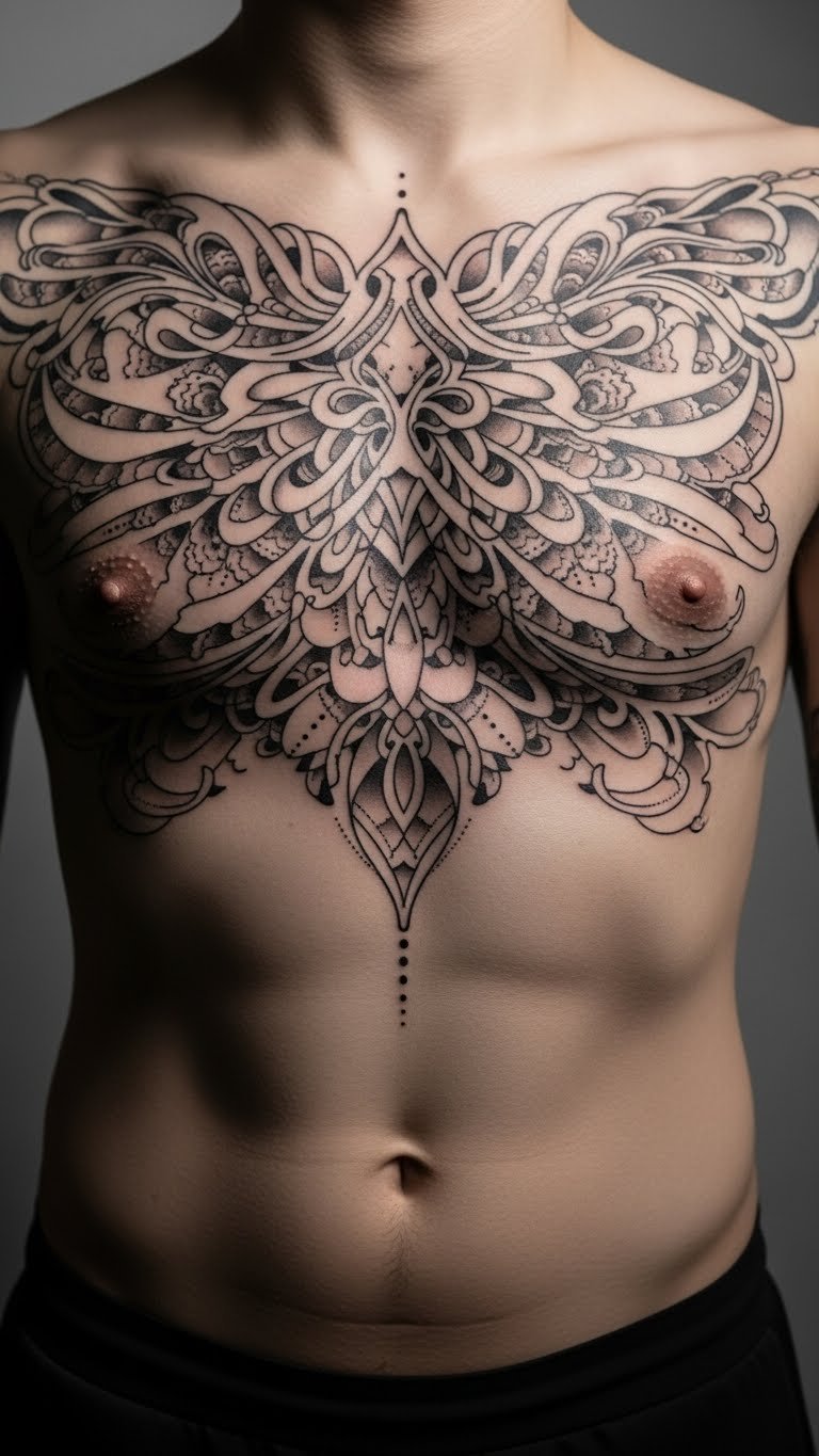 Abstract swirl elements whirl on your chest. They move freely. Sketch swirls creatively. Try twists. Look for budget sessions in town. Select one. Go with black ink for strength. It holds. Use swirl templates at home. Trace and check. Center the design. This swirls with you. Pick for expression. Like energy. Make it fitting. Easy to manage. Middle chest tattoos empower your style with beauty and meaning. Pick a design that speaks to you, try it out at home, and find an affordable artist. Start your journey today for a look that’s all yours.