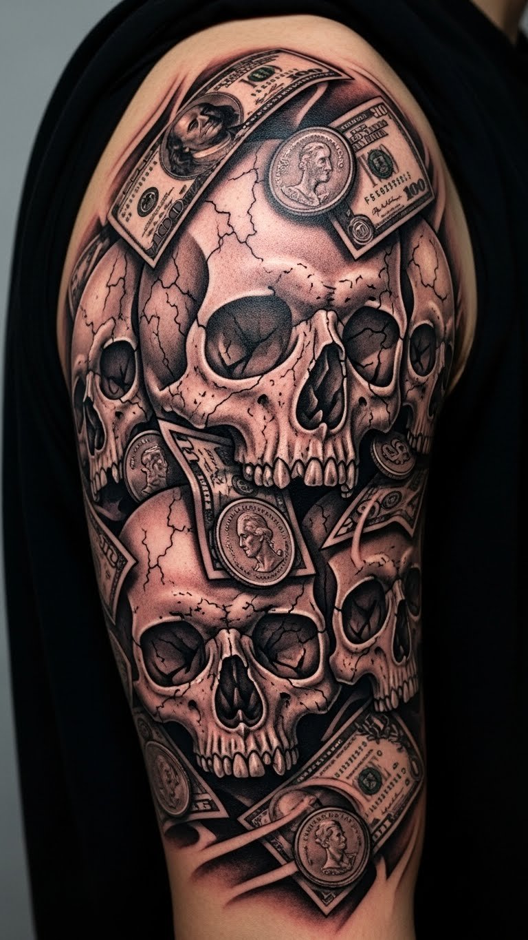 A skulls and money fusion tattoo mixes edge and wealth. Skull with bills on your arm. It adds depth. Draw fusions—creative and free. Pay $220; find matches. Tattoo on arm. Personalize; use sketches. Care is straightforward.