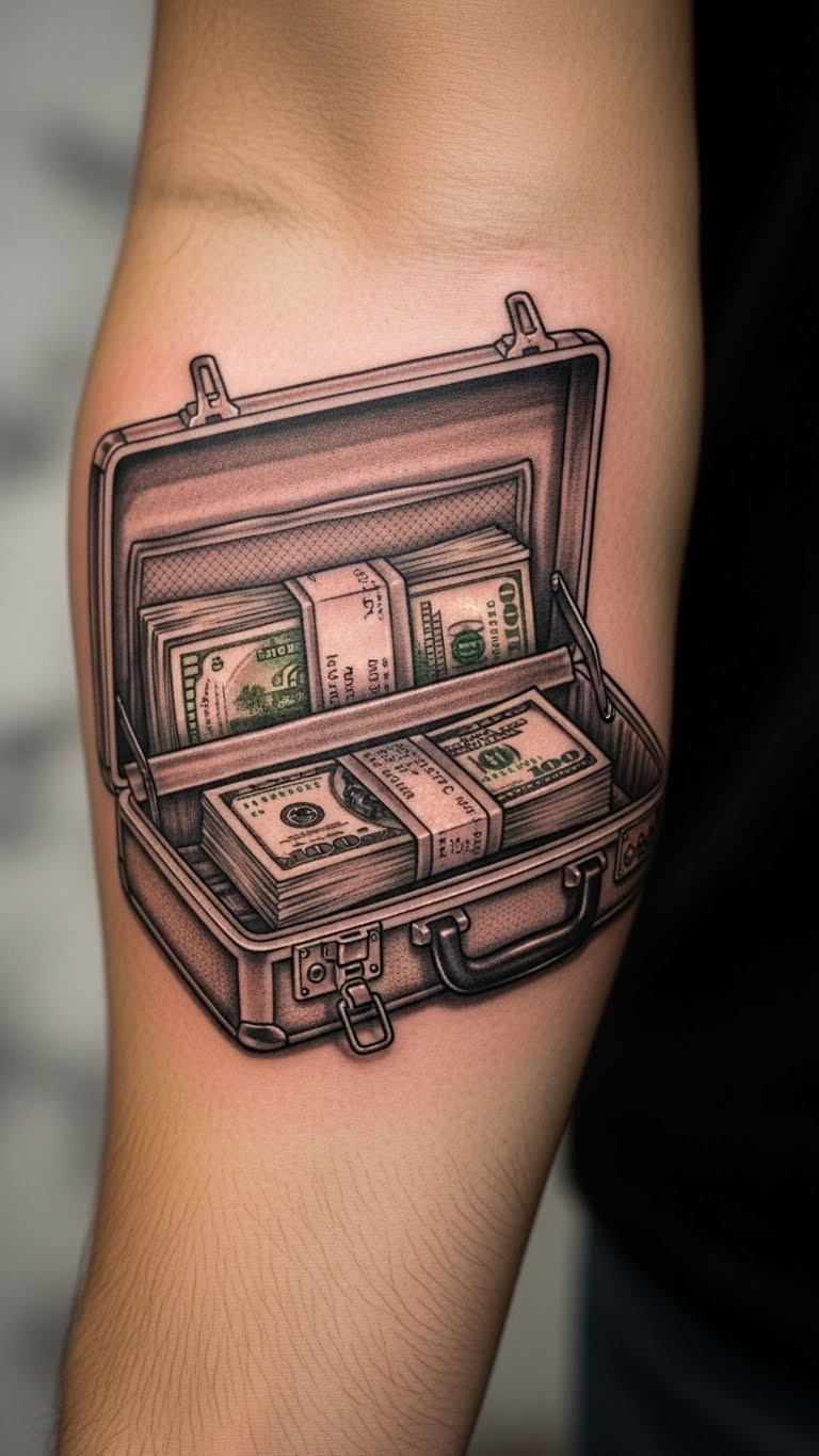 A detailed briefcase tattoo means business. Briefcase on your arm. It shows readiness. Plan details. Cost $240; research. Place on arm. Add items; edit ideas. Care is easy.