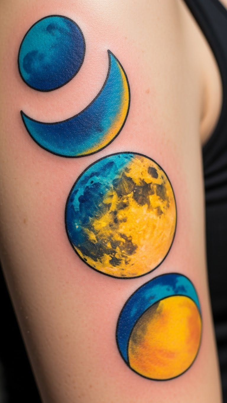 Bring color to your moons for a fun twist. Vibrant colorful moons pop with blues and yellows on your arm. Mix paints at home to sketch ideas on canvas first. Book a session for $150 to $300 with an artist who uses safe pigments. Add stars in rainbow shades for extra flair. Download free editing tools to colorize photos of your body before committing. Choose smaller areas to cut costs and healing time. Practice with washable markers on your skin, under $2, for quick tests. This design brightens outfits and moods.