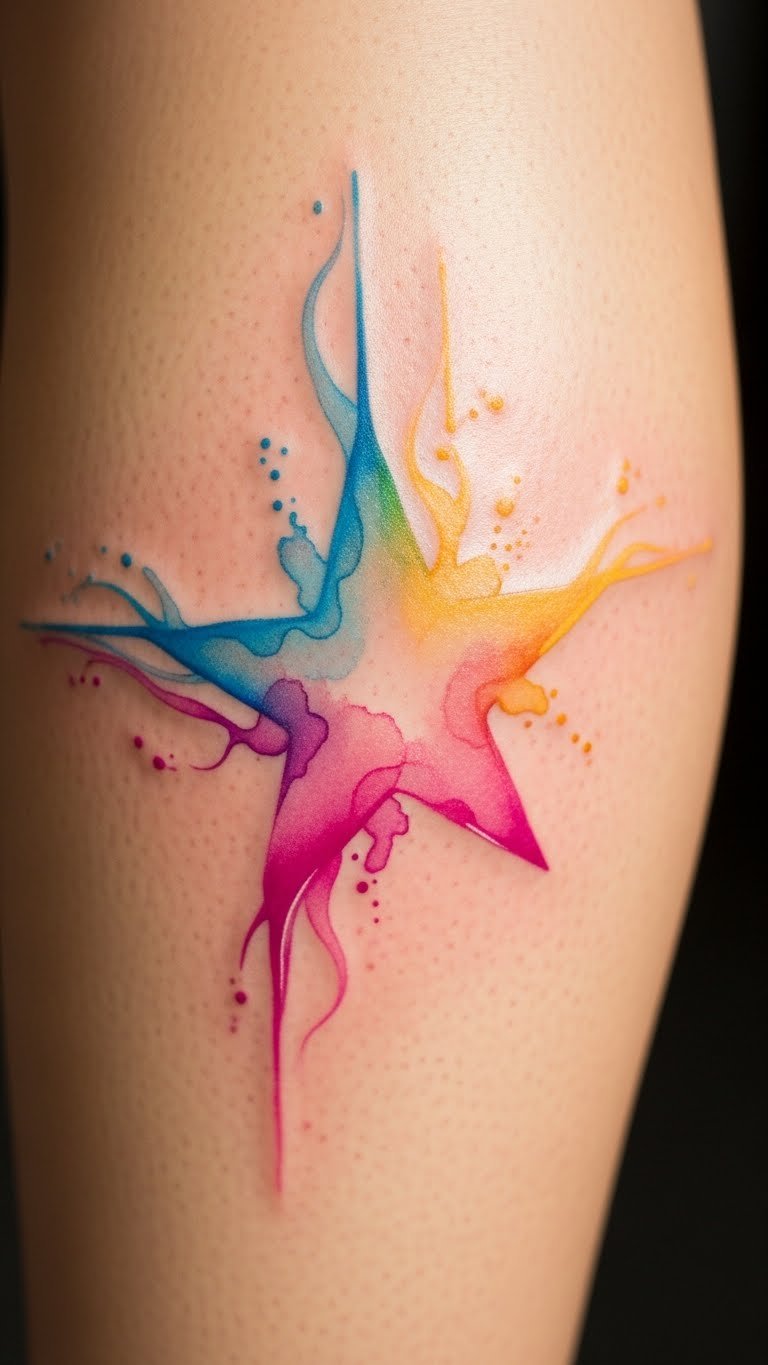 Let stars flow like paint on your leg. A watercolor star burst adds soft edges and blends. Grab watercolors and paper to experiment at home for free. Find an artist specializing in this for $200 to $400. Layer stars with light colors to keep it fresh. Use social media filters to simulate the look on your photos without cost. Go for fade-friendly ink to extend wear. Try fabric markers on clothes, around $5, to mimic the effect temporarily. It’s easy to cover for daily life.