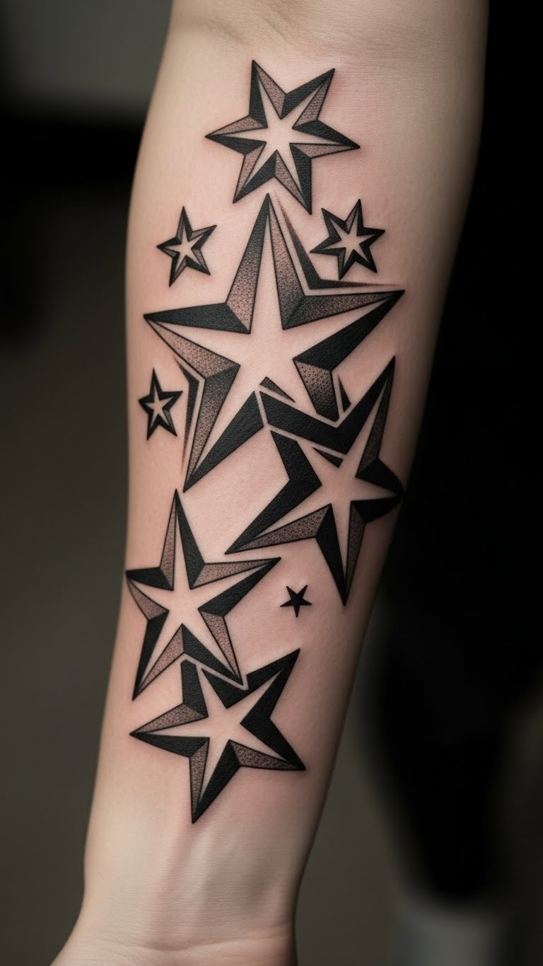 Make stars sharp and modern. Bold geometric stars stand out on your forearm. Cut shapes from paper to plan at home. Book for $180 to $400 with a geometric specialist. Layer patterns for impact. Use graphic apps to design on your screen for free. Choose black and white to lower expenses. Test with geometric stencils, under $10, for accuracy. This style grabs attention.