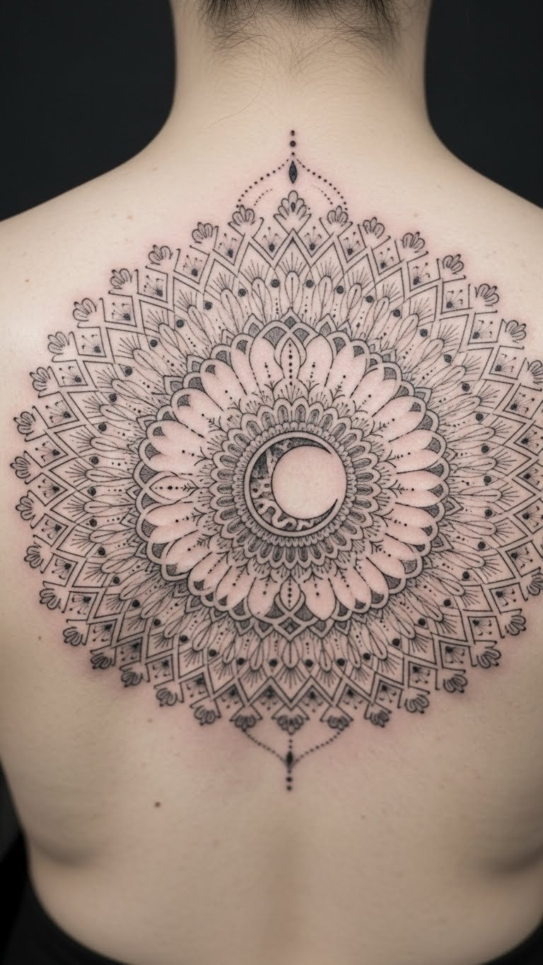 Create circles of calm with moons. A mandala moon circle spreads on your back for peace. Draw mandalas on paper to build skills. Hire for $250 to $450 with a pattern expert. Center the moon for focus. Use drawing apps to trace designs for free. Go for symmetrical shapes to reduce ink use. Test with round stencils, around $4, at home. It’s a meditative choice.