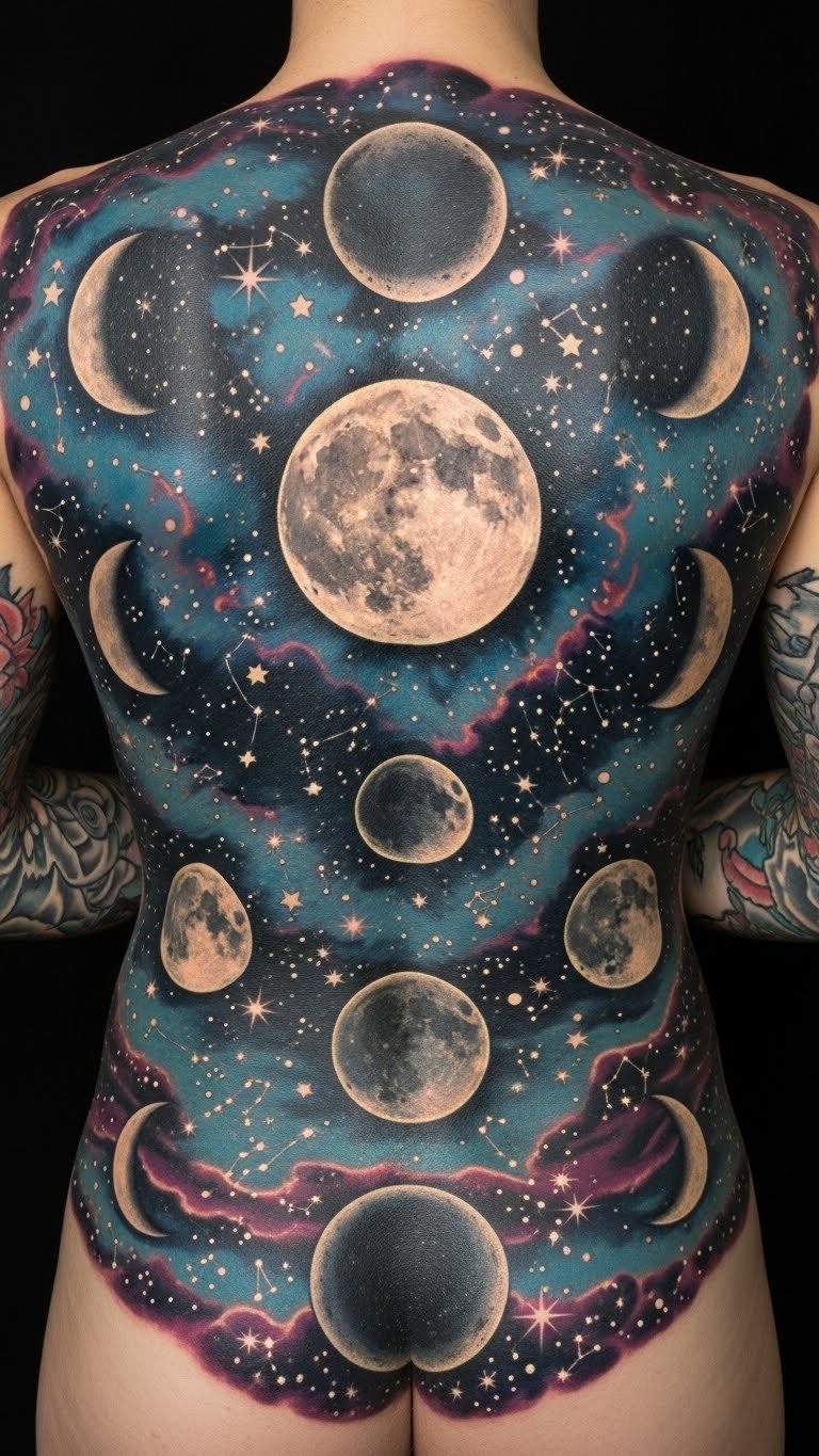 Cover your back with a whole sky. A back full sky scene immerses you in stars. Plan with wall sketches at home. Get it for $400 to $800 from a large-scale artist. Add personal elements like phases. Use photo editors to visualize on your back at no cost. Break it into sessions to manage expenses. Practice with body paint, around $10, for a feel. This becomes your canvas.