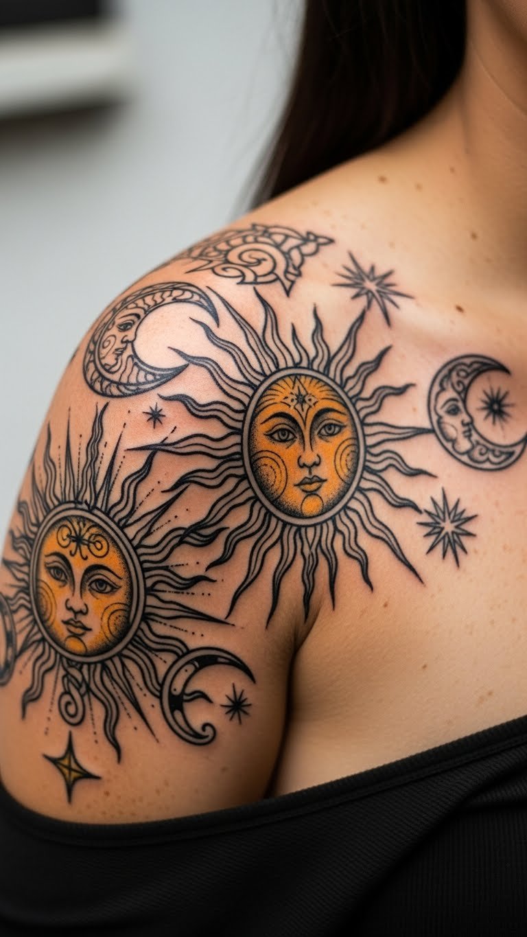 Balance day and night on your skin. A sun and moon pair works on your collarbone for symmetry. Sketch suns and moons side by side on scrap paper. Find an artist for $100 to $250. Make one side bold and the other soft. Use free design software to flip ideas on your device. Opt for matching sizes to fit budgets. Test with dual-sided stickers from dollar stores. It’s a classic duo that inspires.