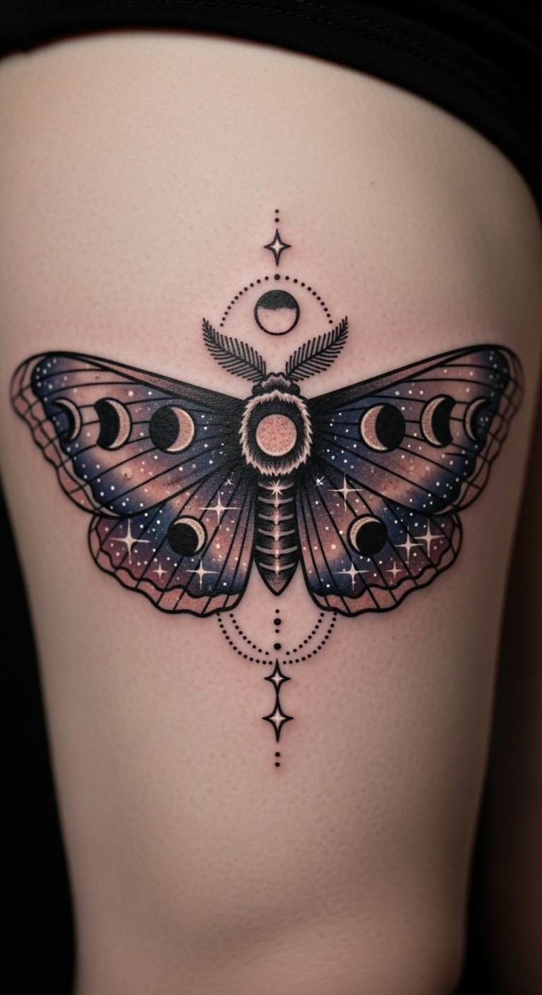 Celestial moth tattoos add stars for a starry night feel. Wings hold the universe. Map it out with star stickers on paper. Print star patterns for under $5. Place on your thigh for a personal touch. Break into stars first, then moth. Customize with glow-in-the-dark tape for fun. For instance, trace constellations before inking. This theme sparks wonder—test with fabric markers. Simple steps make it exciting.