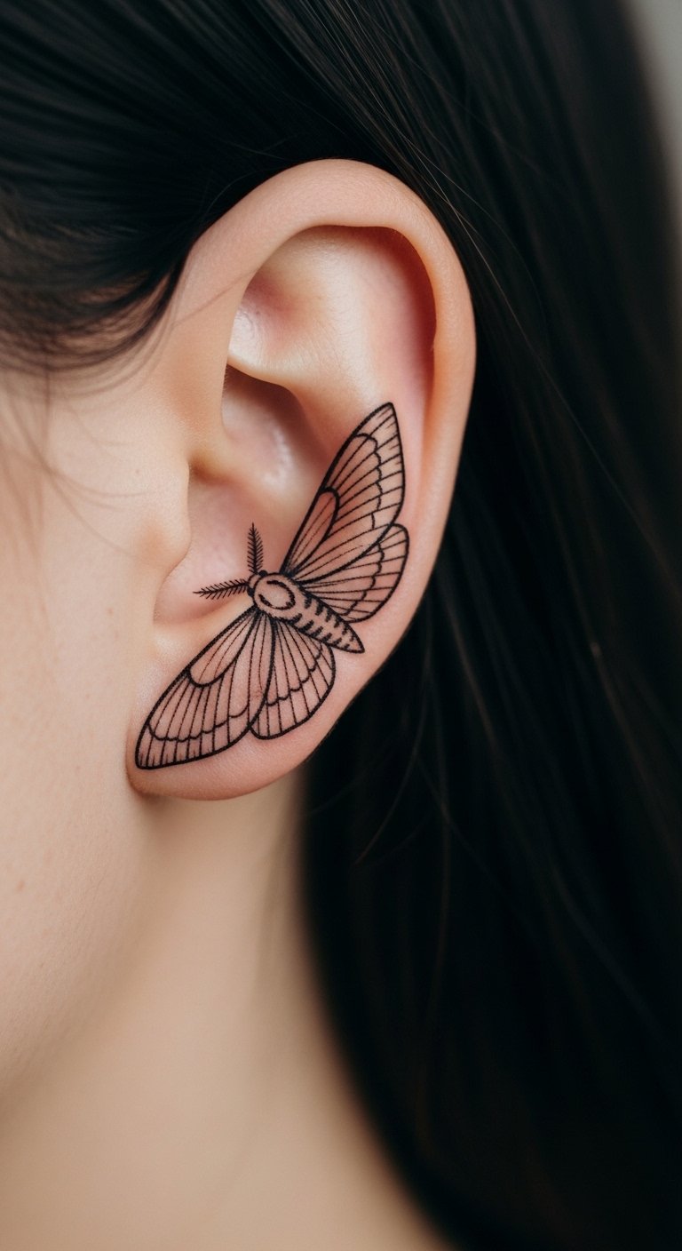 Small delicate moth tattoos fit hidden spots. Behind the ear adds mystery. Sketch tiny versions on note paper. Get temporary ones for pennies. Place for easy concealment. Keep design basic: one wing shape. Add with a fine brush at home. For example, use nail art pens for practice. This size works for first-timers—wipe clean after. Quick tests help decide.