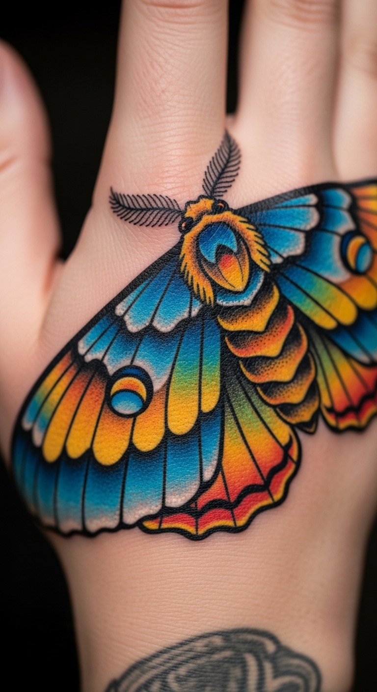 Vibrant butterfly-inspired moth tattoos mix colors boldly. Wings pop with life. Color in drawings with crayons first. Buy colored tapes for cheap layouts. Put on your hand for expression. Break down: base color, then patterns. Customize with fabric dyes. Real idea: paint on fabric to see it move. This design energizes—focus on bright spots. Easy supplies let you create.