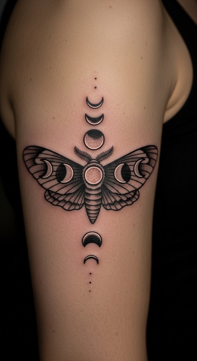 Mystical moth tattoos include moon phases for depth. Wings tell lunar stories. Plan with moon charts on paper. Use round stickers for phases. Try on your rib for intimacy. Split: moons on wings. Add with circular stamps. For instance, trace on with moon-shaped tools. This theme connects deeply—keep it symbolic. Budget options make it feasible.