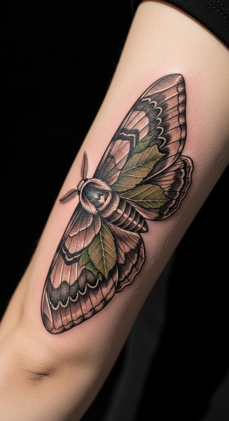 Naturalistic moth tattoos blend leaves for earthiness. Wings flow like foliage. Draw leaves around moths on scrap paper. Find leaf templates online. Place on your elbow for utility. Divide: leaves first. Personalize with real leaves for tracing. Real tip: press leaves for accurate designs. This style grounds you—test with green shades. Simple actions bring nature close.