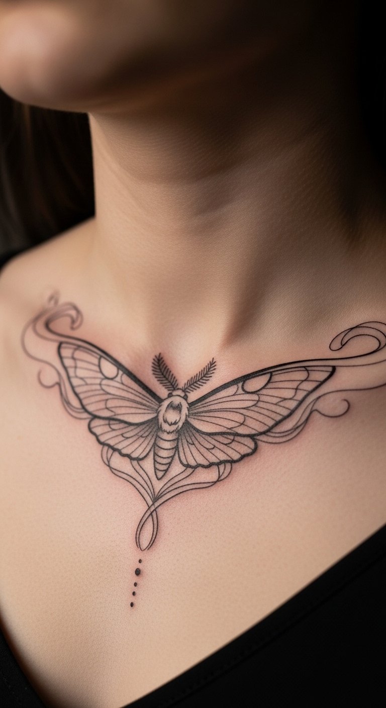 Feminine moth tattoos use curves for softness. Wings sway gently. Outline on paper with flowing lines. Get curve stencils cheap. Try on your collarbone for grace. Keep simple: curves only. Add with ribbon for mock-up. Real example: trace with soft pencils. This design flatters—test placement. Easy steps enhance appeal.