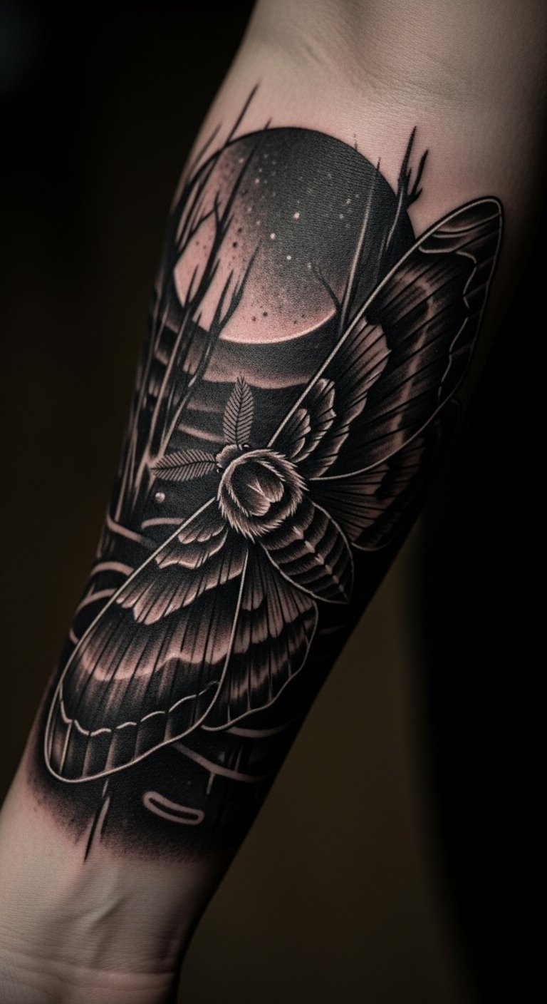 Nocturnal moth tattoos use dark colors for night vibes. Wings hide in shadows. Shade drawings with dark pencils. Buy dark inks for tests. Put on your forearm for night feel. Break down: dark base. Add stars with dark dots. Real idea: draw in low light. This theme captivates—focus on depth. Simple supplies work well.