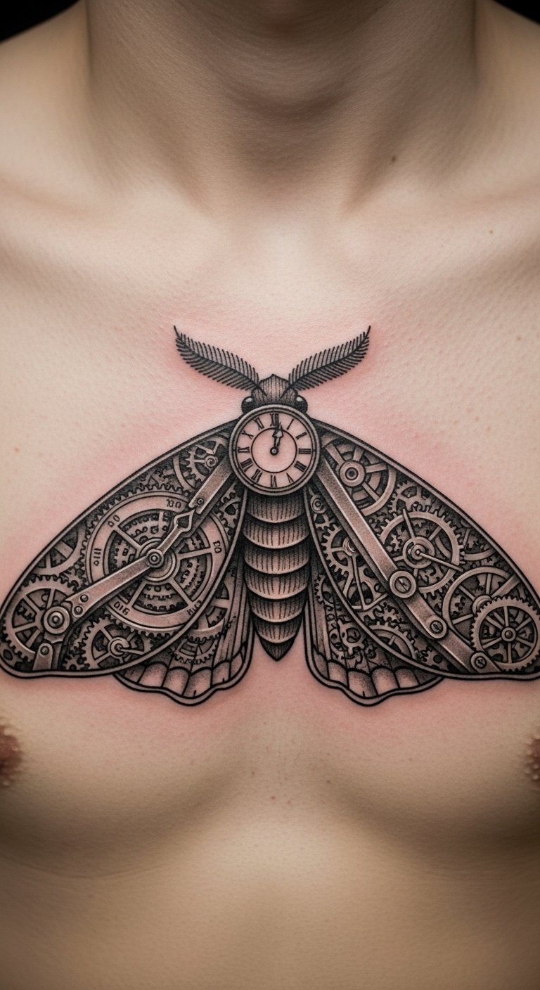 Moth and clock tattoos merge time with flight. Wings tick like clocks. Draw gears on paper. Find clock images online. Place on your chest for time. Divide: clock parts. Add with gear shapes. For instance, use watch parts for ideas. This theme tracks life—test with drawings. Simple ways build it.