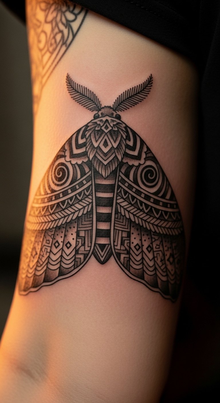 Cultural moth tattoos use patterns from heritage. Wings tell stories. Research patterns online. Print cultural designs. Put on your arm for pride. Break into: pattern sections. Add with cultural art. For example, trace from books. This design honors roots—test with prints. Easy steps celebrate.