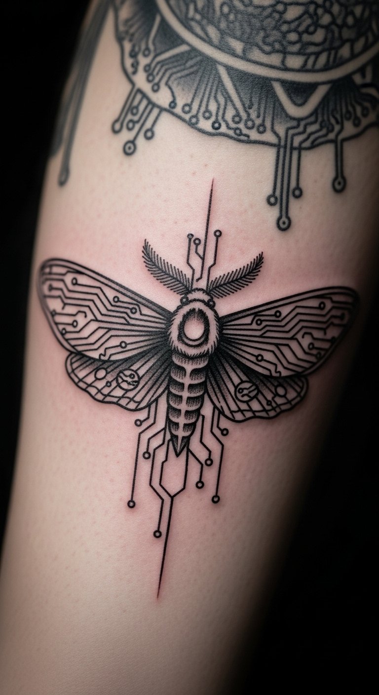 Modern moth tattoos add circuits for tech. Wings wire up. Draw circuits on paper. Use circuit diagrams. Try on your leg for future. Divide: circuits first. Personalize with tech symbols. Real tip: use phone screens for ideas. This look advances—keep it current. Budget options innovate.