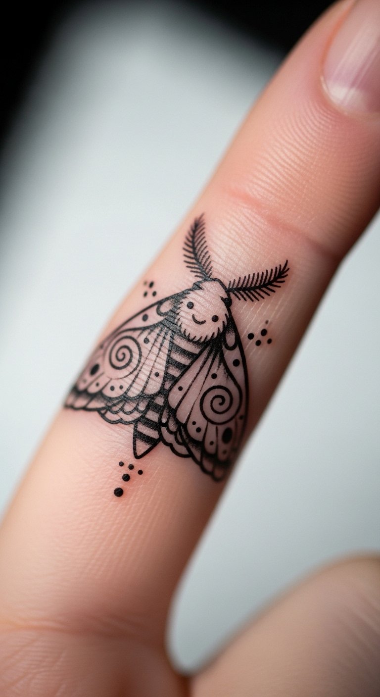 Whimsical moth tattoos add fun details. Wings play with shapes. Doodle extras on paper. Get fun stickers. Place on your finger for joy. Keep playful: add dots. Customize with colors. For instance, draw with crayons. This design amuses—test with laughs. Simple tools make it delightful.
