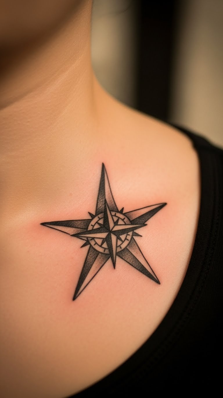 Collarbone tattoos add a touch of grace to the nautical star, making it feel elegant and strong. Position it centrally for balance. Go for a design with pointed tips to echo the North Star. At home, trace a star shape on your mirror with washable marker to see how it flows—free and fun. Keep it small, about 2 inches, for quicker sessions and lower costs, around $60-100. Look for walk-in specials at nearby studios. Add a thin line border to personalize without extra charge. Cover it with a scarf for formal events. Simple advice: Prep your skin by moisturizing a day before to help the ink set. This spot suits active folks—show it off with tank tops. Start today: Grab a friend and visit a shop to discuss ideas in person.