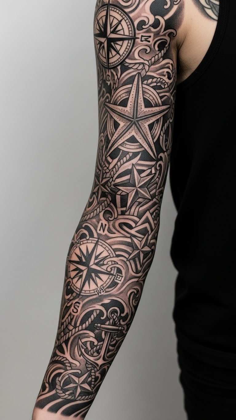 Build a full arm sleeve around a nautical star for a grand narrative. Start from the shoulder down. Include multiple stars with themes. At home, wrap your arm with string to outline—free method. Budget over sessions, totaling $300-500. Look for payment plans. Add elements step by step. Long sleeves offer coverage. Hack: Get one section at a time to manage costs. This idea tells a life story—flex it proudly. Do it: Plan your theme tonight.