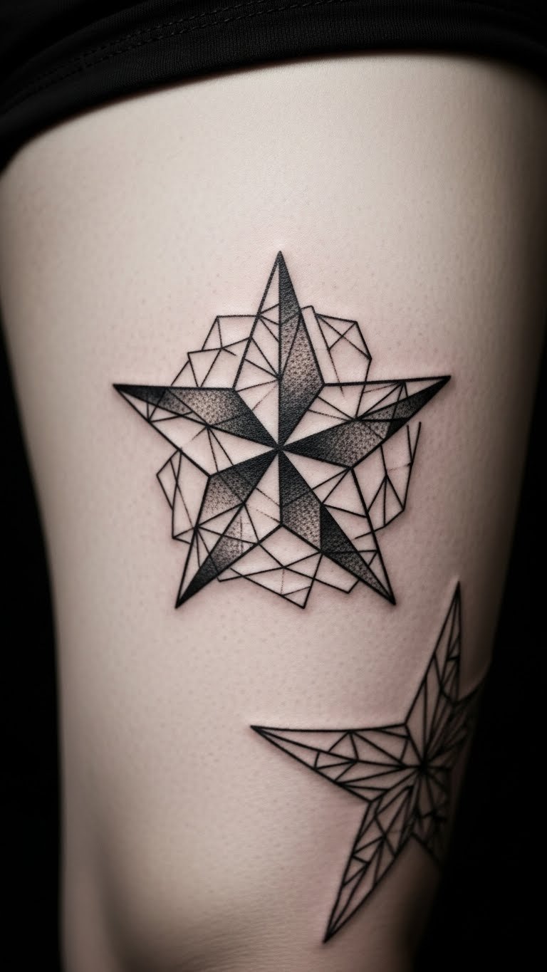 Add geometry to your nautical star for a modern edge. Put it on the thigh for stability. Incorporate triangles and shapes. Home idea: Cut geometric stencils from cardboard—free fun. Cost around $80-110. Seek modern design deals. Layer shapes simply. Pants conceal it quick. Hack: Measure the area for fit. This design fits trendsetters—stride with style. Do it: Sketch geometric ideas.