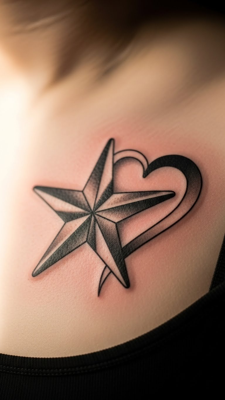 Infuse heart into your nautical star for love and direction. Put it on the chest center. Merge points with a heart. DIY: Combine shapes on paper—quick idea. Expect $70-100. Look for love designs. Keep it simple. Shirts cover easily. Tip: Feel the emotion. This warms the soul—embrace it. Start: Sketch the blend.